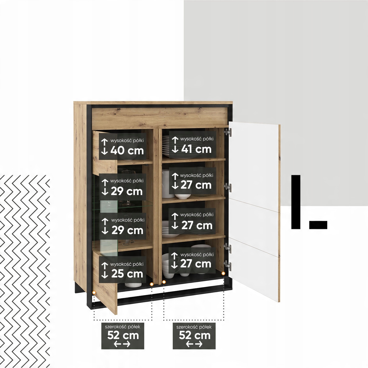Висока шафа-вітрина в сучасному мансарді стиль. Тонка чорна підставка та цікавий декор підкреслюють сучасний стиль меблів. Функціональне поділ інтер'єру дозволяє приховати одні предмети і цікаво відобразити інші. У лівій частині меблів ви знайдете закриту книжкову шафу з полицями. Права сторона розділена на зону із склінням та частину з двома шафами. Вітрина має два типи світлодіодного підсвічування - зовнішнє, що підкреслює просторовий характер фасадів (доступна в комплекті) і внутрішнє, розміщене в заскліній частині (доступно як додаткова опція). Вітрина виготовлена з міцного ламінованого картону, покритого міцною кромкою з АБС. Комфортне використання забезпечується механізмом PUSH TO OPEN.