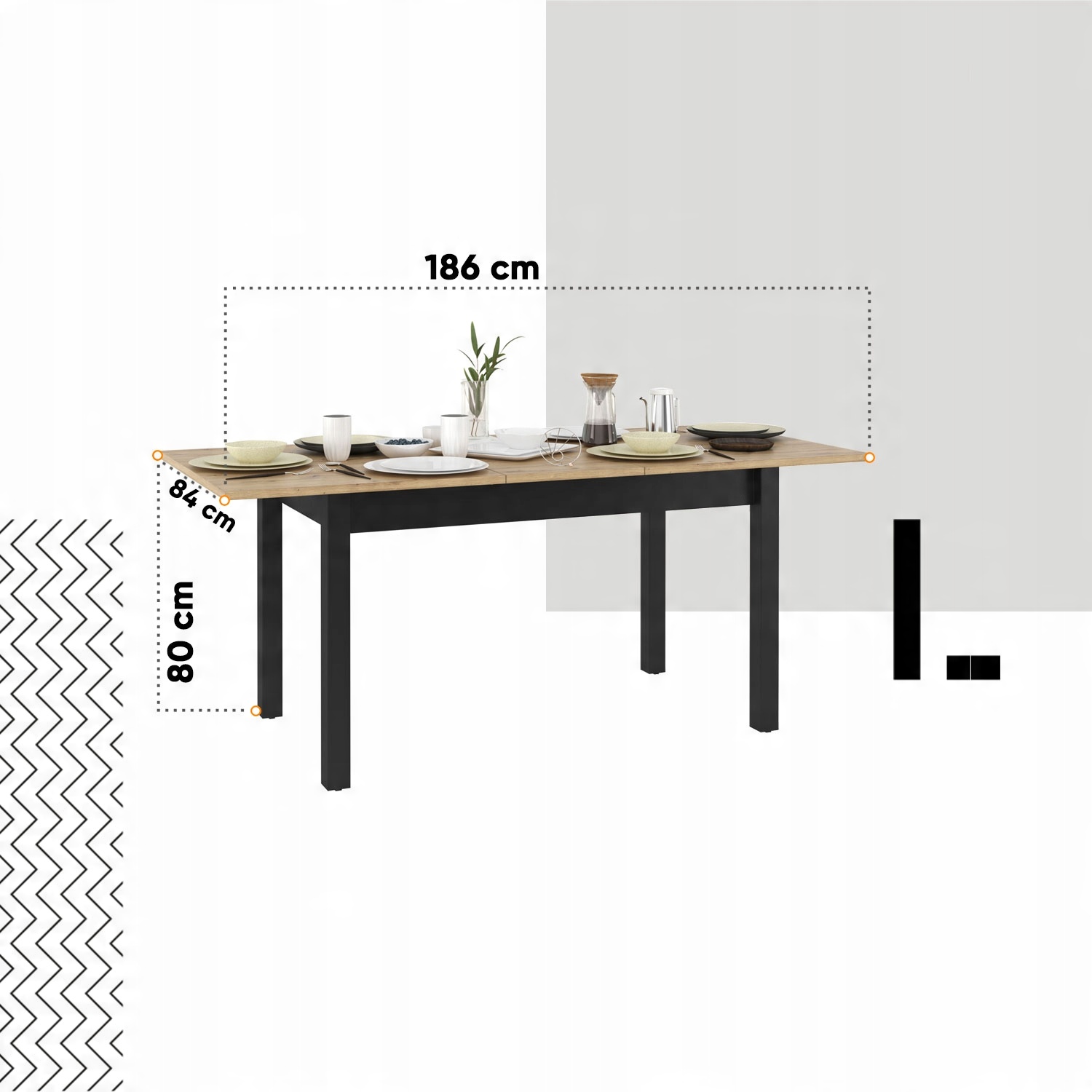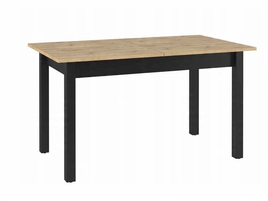 Елегантний , розсувний стіл в сучасному стилі. Чорні тонкі ніжки в поєднанні з верхом, що імітує натуральне дерево, створюють комплект з унікальним лофтовим характером. Розкладений стіл ідеально підходить для повсякденного прийому їжі, а розкладений стіл дозволяє проводити зустрічі у великих групах. Меблі виготовлені з міцної ламінованої плити, обробленої міцною кромкою з ABS.