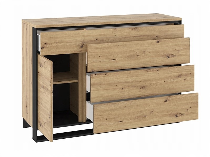 Широкий комод з чотирма місткими ящиками ящики, в яких зручно зберігати документи, одяг або інші дрібниці. До складу комода також входить велика шафа з дверцятами. Комод виконаний в модному стилі лофт. Цікавий декор з чітким деревним малюнком чудово виглядає з чорними деталями. Тривимірний характер фасадів додатково підкреслив світлодіодне освітлення. Меблі виготовлені з міцної ламінованої плити, покритої міцною кромкою ABS. Комфортне використання забезпечується механізмом PUSH TO OPEN.
