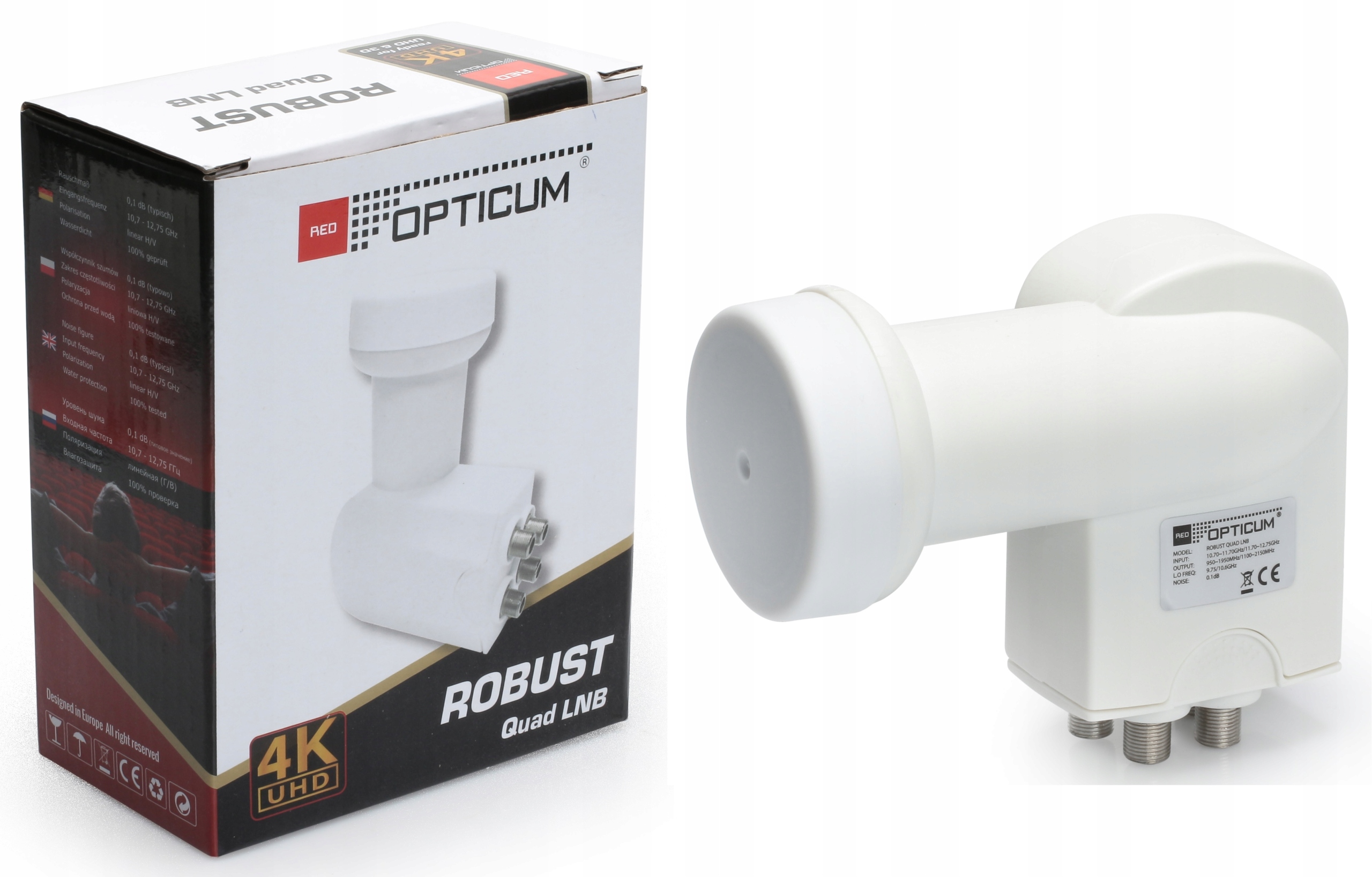 має дощову силу гніздова кришка f . Він характеризується низьким коефіцієнтом фази фазового шуму 0,1 дБ. перетворювач, призначений для співпраці з MultiSwitch, а не для прямого з'єднання з декодером/телевізором.