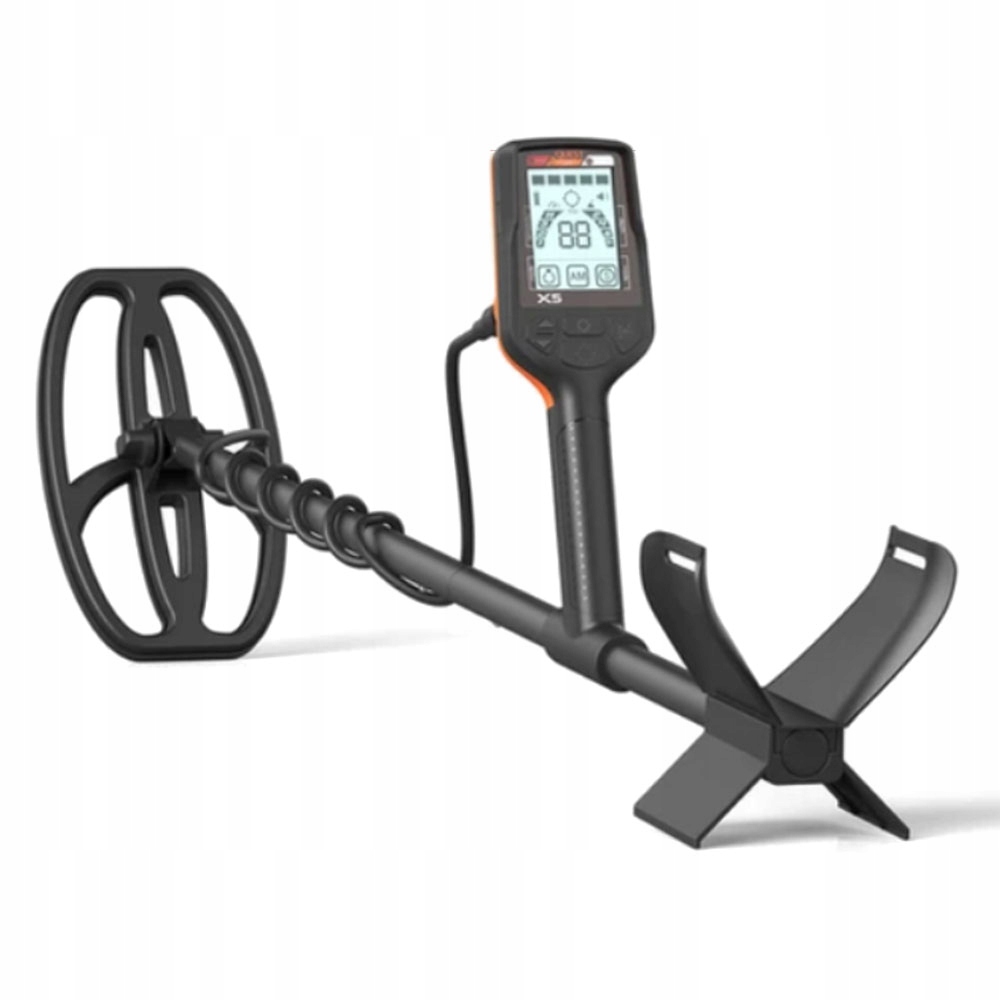 Детектор X5 також легкий і компактний. Завдяки складаним кронштейнам пристрій не займає багато місця і його легко транспортувати. Підлокітник з двох частин гарантує комфорт під час пошуку. Палиця складається з 3 елементів, завдяки чому детектор легко складається на довжину 80 см і розкладається на довжину 130 см. Сповіщувач також має LCD екран з підсвічуванням розміром 60х45 мм. На ньому ви знайдете, серед іншого: індикатор глибини об'єкта та індикатор рівня заряду батареї.