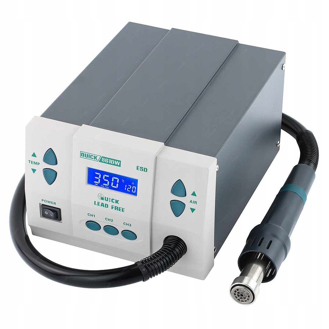 Quick 861DW ESD — це професійна паяльна станція HOTAIR з нагнітачем гарячого повітря потужністю 1000 Вт і потоком повітря 120 л/хв.