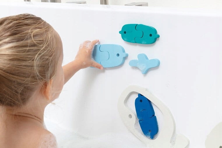 Форми пазлів дозволяють їх комбінувати різними способами (наприклад, риб можна об’єднати в пари кольорів або менші елементи можна помістити всередину великого кита), а після намокання, їх можна клеїти на поверхню ванни чи плитки, створюючи різноманітні конструкції, і грати так, як підказує дитяча уява.