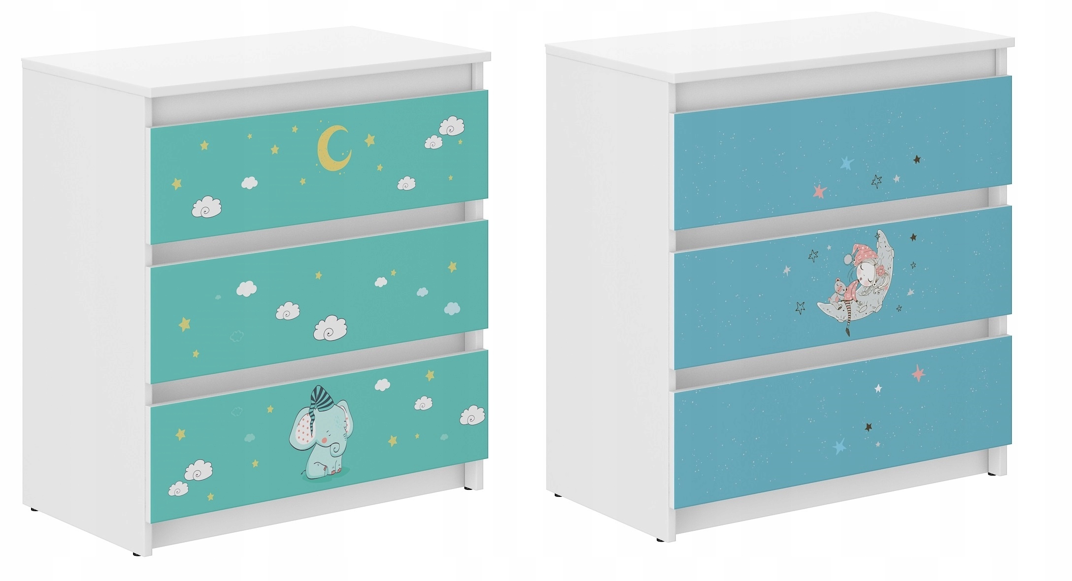 Сучасний комод R-3 - це практичний і функціональний предмет меблів, який знайде своє місце в кожній дитячій кімнаті. Ергономічні розміри забезпечують вільне облаштування приміщення. Комод виготовлений з ДСП білого кольору, оздоблений шпоном. Складається з трьох висувних ящиків, встановлених на напрямних, які оснащені обмежувачами для запобігання повного висування. Дверцята комода мають барвистий принт, який має приємні яскраві кольори та захищений спеціальним ламінатом, щоб запобігти вицвітанню та стиранню. Ви можете прати його тканиною та рідиною без будь-яких турбот.