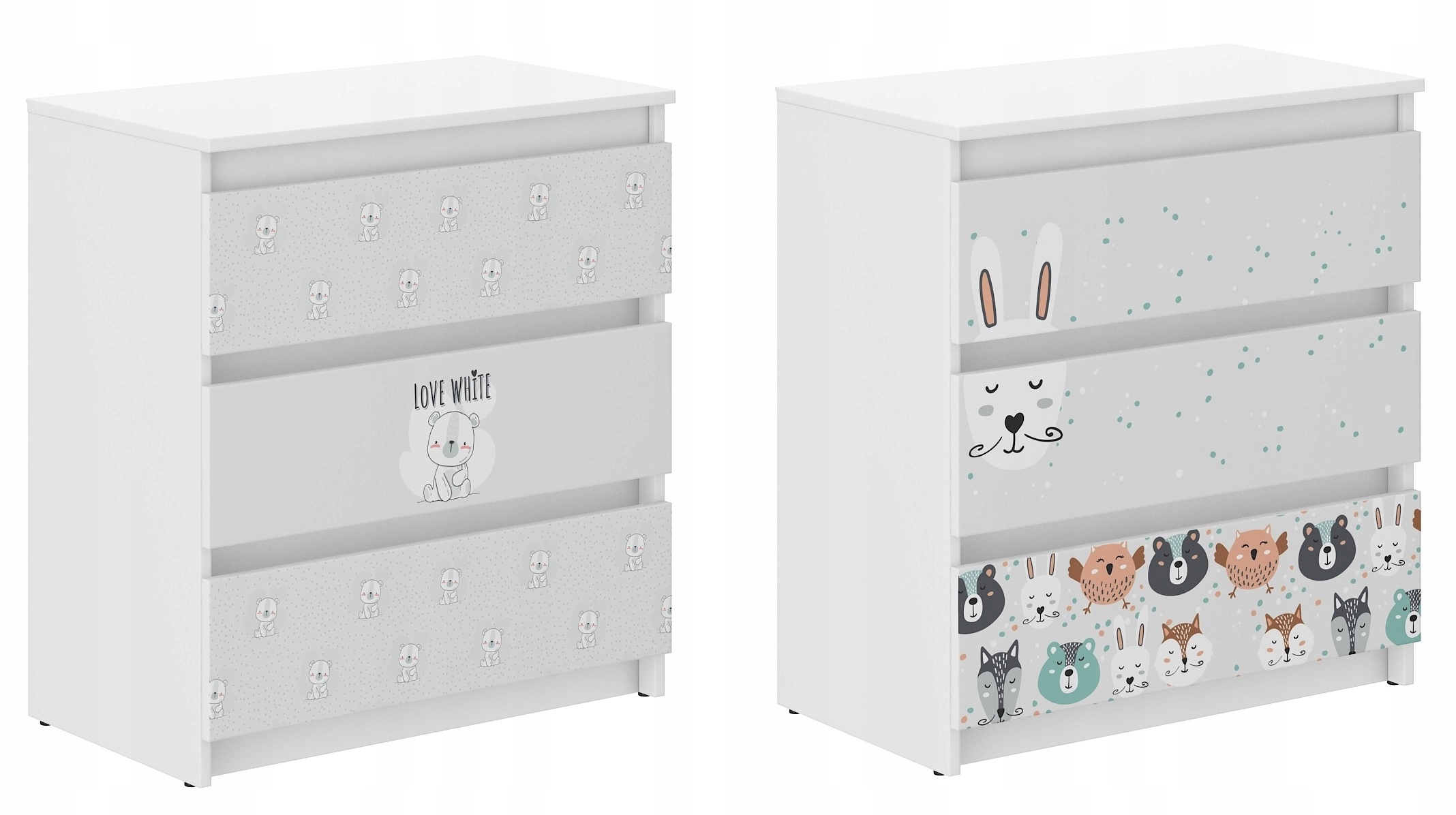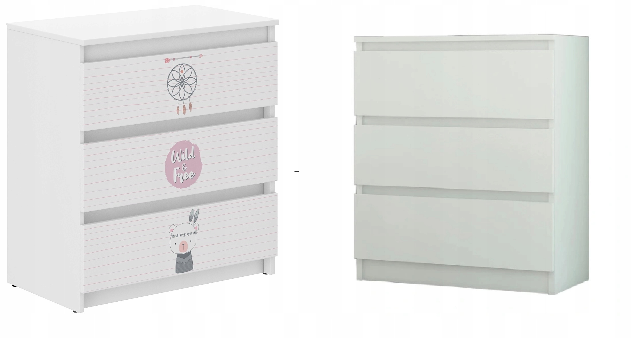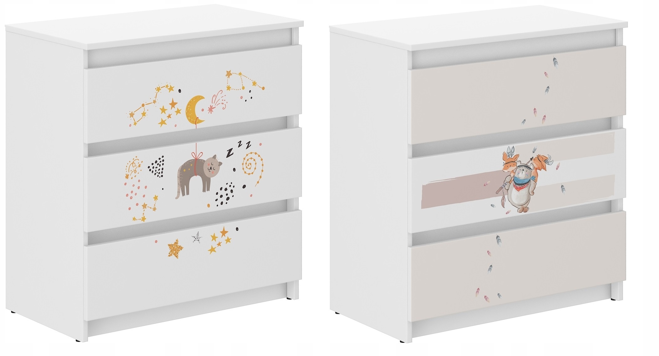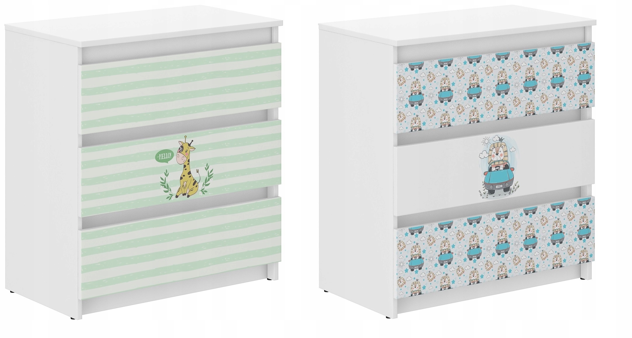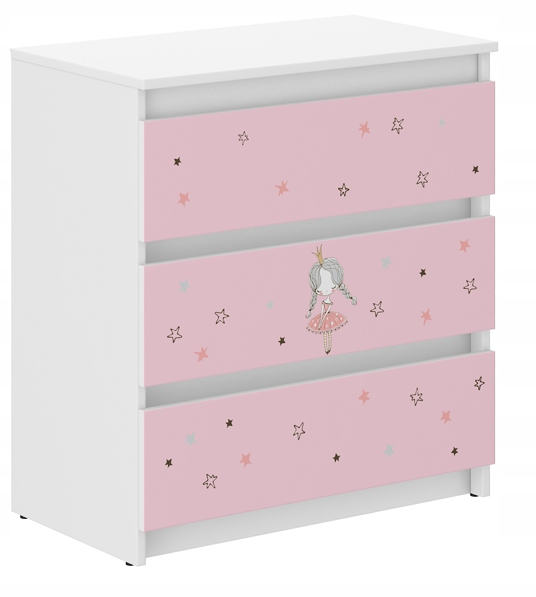 Сучасний комод R-3 - це практичний і функціональний предмет меблів, який знайде своє місце в кожній дитячій кімнаті. Ергономічні розміри забезпечують вільне облаштування приміщення. Комод виготовлений з ДСП білого кольору, оздоблений шпоном. Складається з трьох висувних ящиків, встановлених на напрямних, які оснащені обмежувачами для запобігання повного висування. Дверцята комода мають барвистий принт, який має приємні яскраві кольори та захищений спеціальним ламінатом, щоб запобігти вицвітанню та стиранню. Ви можете безпечно випрати його тканиною та рідиною.