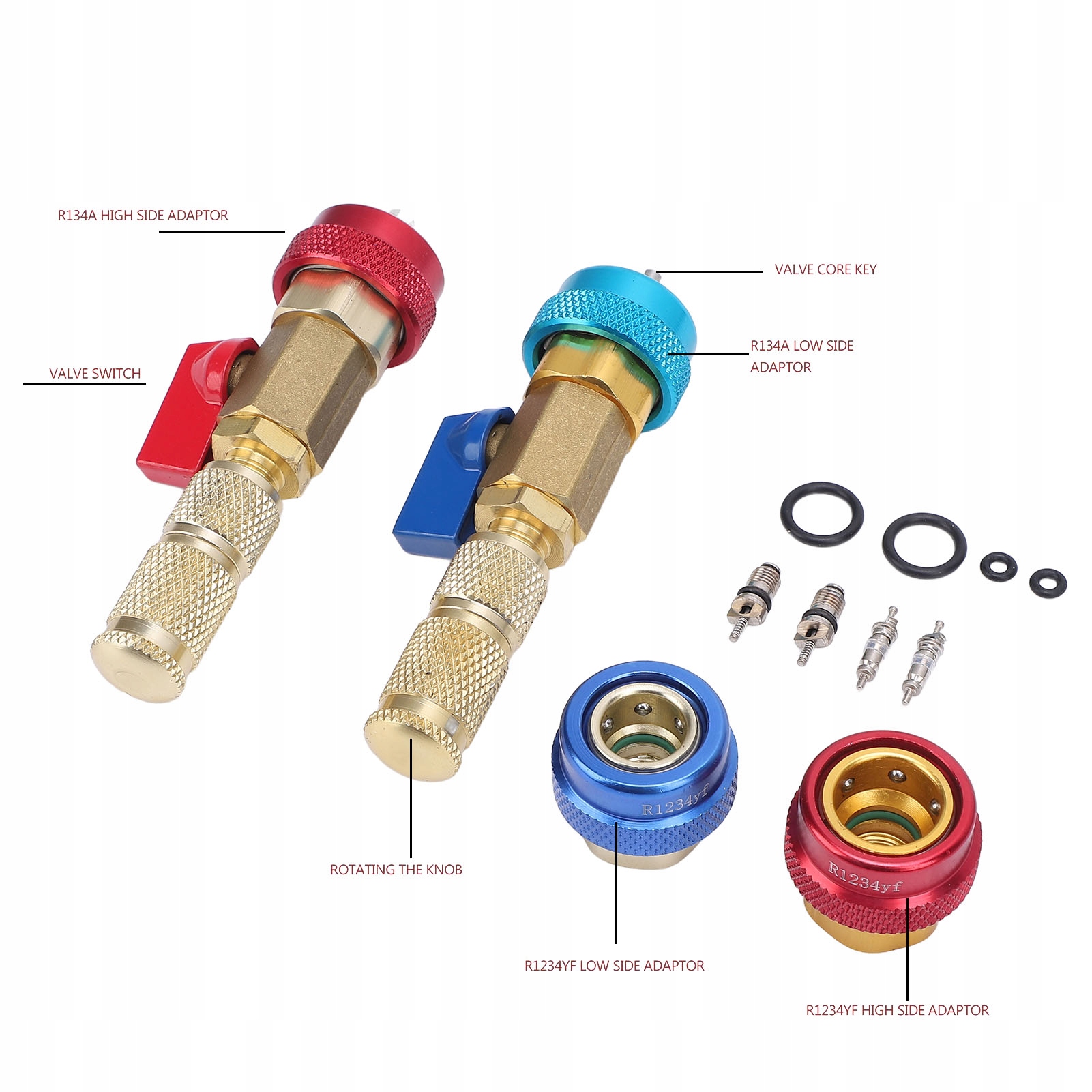 3. МАТЕРІАЛ: Цей інструмент для швидкого розбирання котушки в основному виготовлений з латуні, штифт виготовлений з нержавіючої сталі, а червоний і синій клапани виготовлені з алюмінію. Він має кульовий кран, який відкривається та закривається лише на чверть оберту без втрати газу.