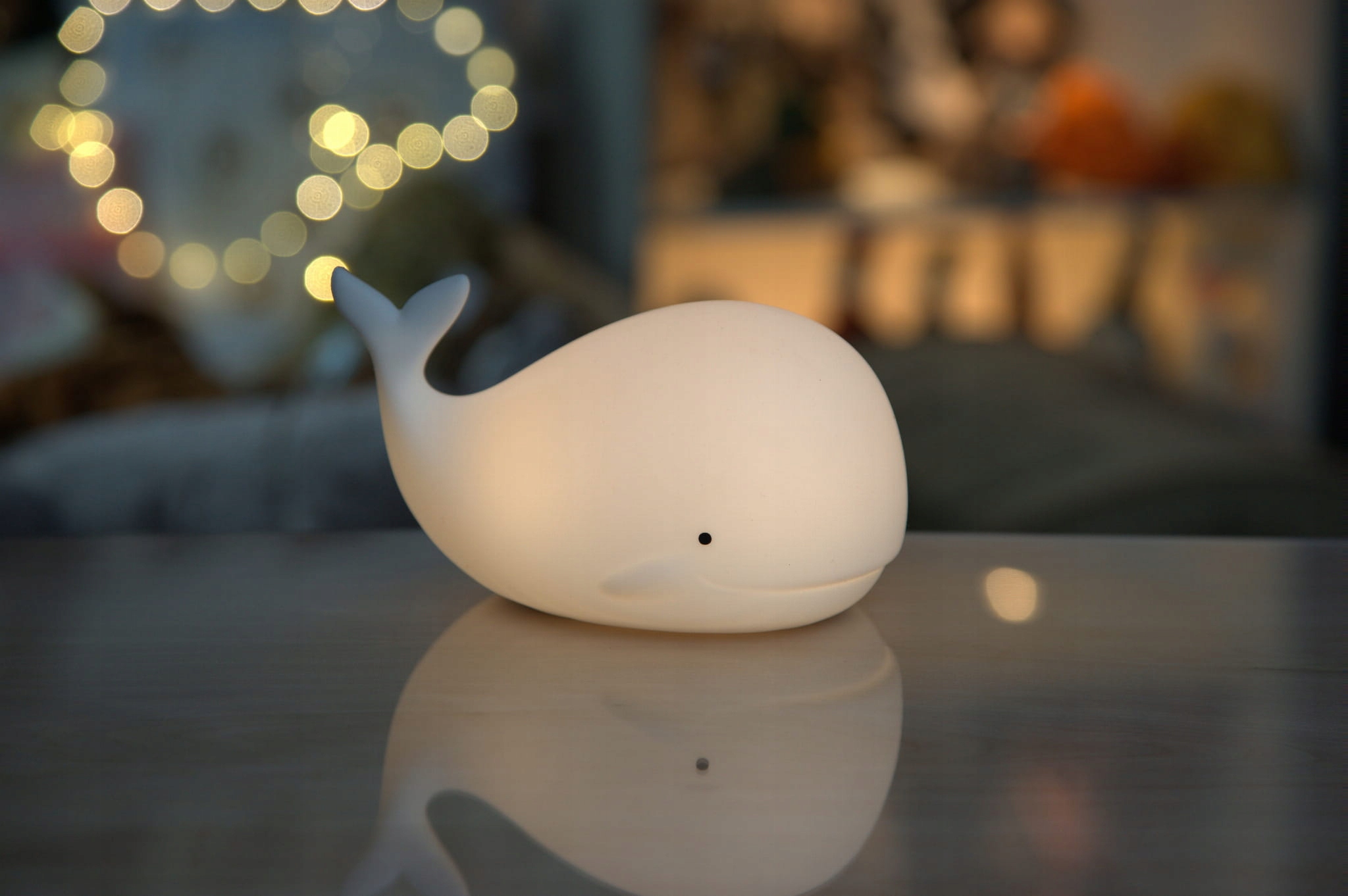 Світлодіодний нічник від Rabbit&Friends робить дитячий сон приємнішим, він має мінливі кольори, чарівний форма кита, бархатиста, приємна на дотик, виготовлена з безпечного силікону.