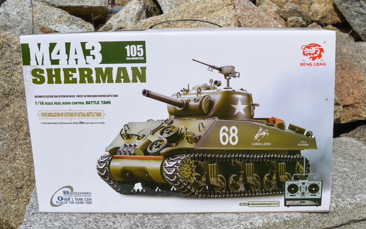Точна копія середнього танка союзників M4A3 Sherman часів Другої світової війни. Ця професійна модель танка в масштабі 1:16 відкриває новий вимір у сфері реалізму завдяки точному виконанню відповідно до історичної моделі. Звукові ефекти забезпечує 4-канальний звуковий модуль, який імітує стрільбу, заряджання та роботу двигуна в чотирьох звукових режимах. Рух моделі забезпечується парою потужних електродвигунів. Тягове зусилля передається пластиковими редукторами на ведучі, натяжні та амортизаційні опорні колеса, закріплені металевими штифтами. Атмосферу реву двигунів доповнює вихлопний дим від вбудованого димогенератора. Вся внутрішня частина резервуара розміщена в пластиковій нижній ванні.