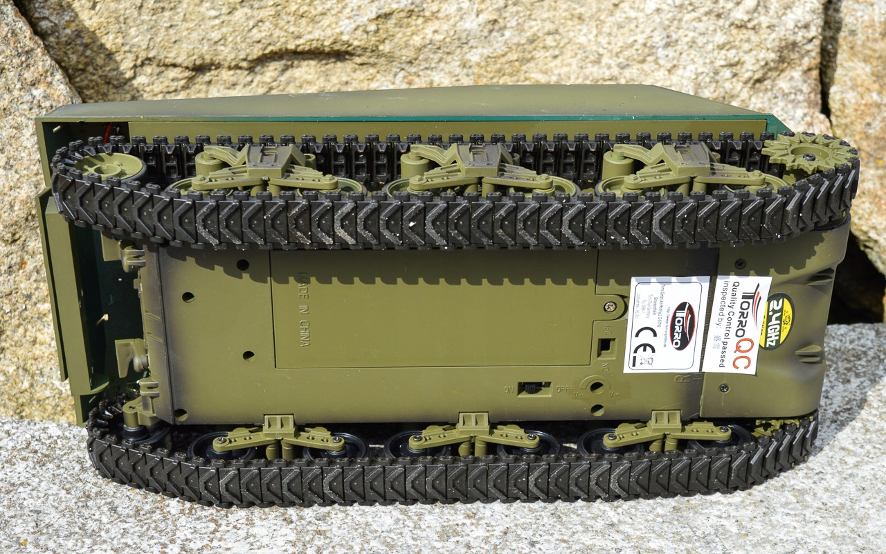 Контролер спілкується з танком за допомогою сучасної європейської частоти 2,4 ГГц і дозволяє керувати декількома моделями. Ви використовуєте його для керування окремими функціями та поведінкою танка. Керування пропорційне, тому ви можете контролювати швидкість руху, швидкість можна перемикати на повільну та швидку. Контролер дозволяє регулювати напрямок руху моделі, поворот вежі, нахил гармати, стрільбу гармати/кулонета та роботу двигуна. Ви можете переключитися на 4 версії звуку двигуна.