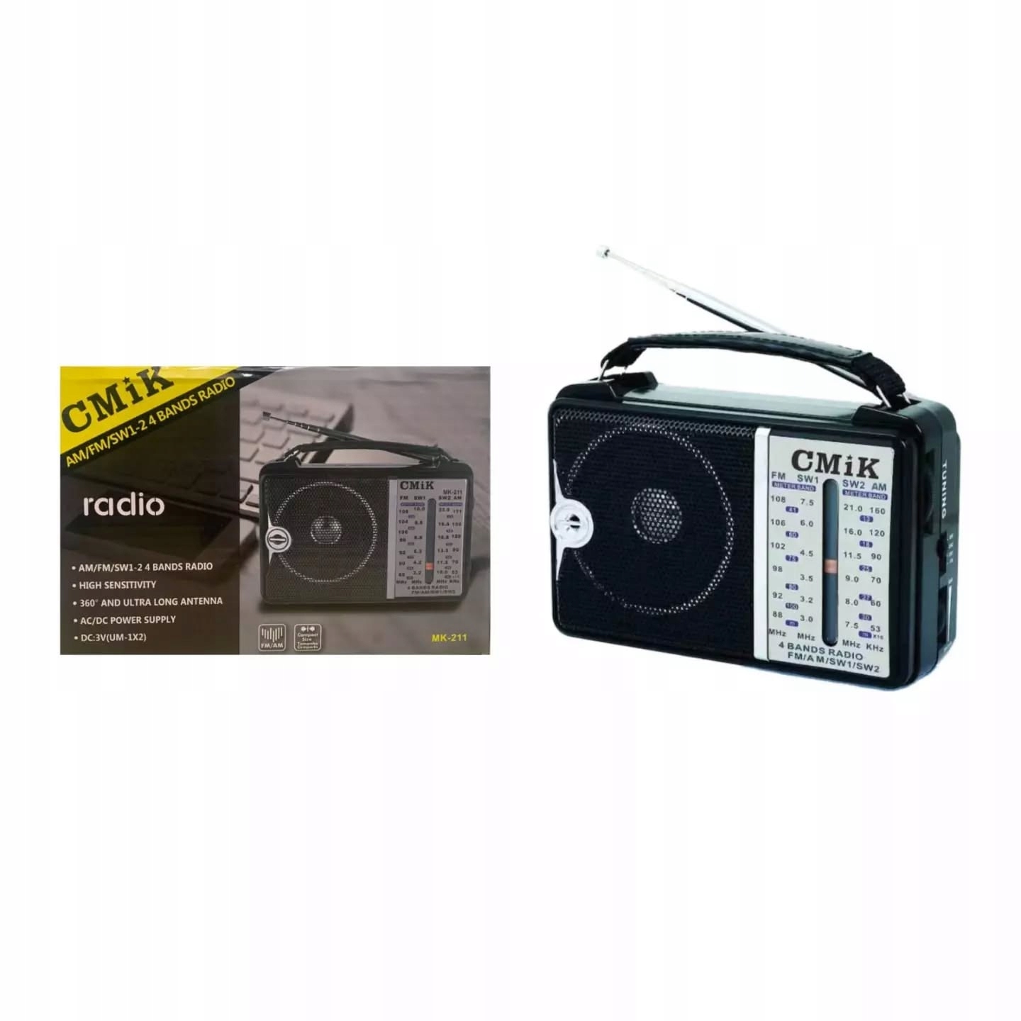 Опис продукту: Радіо CMIK MK-2111-це портативне радіо, яке може отримувати сигнали AM, FM та SW. Він має сильну антену, яка забезпечує відмінний прийом, навіть у районах зі слабким сигналом. Радіо також оснащене вбудованим динаміком та роз'єм для навушників, тож ви можете слухати улюблені програми в конфіденційності. Особливості: