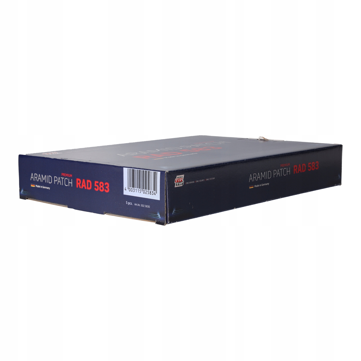 ремонт вставки 583 Aramid Premium, розміри 245 х 190 мм посилюються одним шаром шнура арамідного шнура з додатковим нейлоновим шаром, який стабілізує це зміцнення. Цей зміцнюючий пакет дозволяє ідеально відтворити міцність відремонтованої шини.