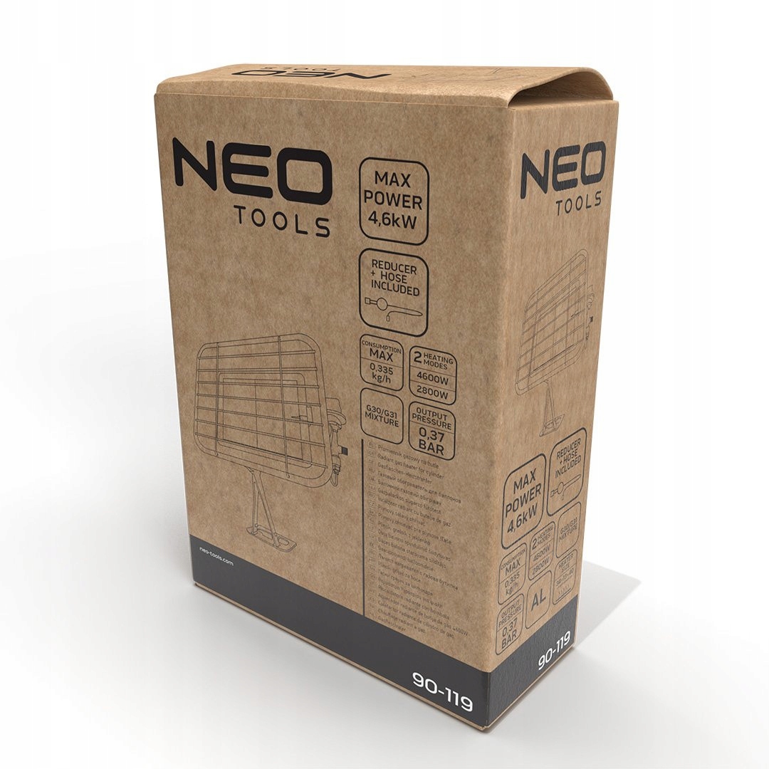 Газовий радіатор NEO Tools, модель 90-119, максимальна потужність 4600 Вт. Газобалонний пристрій, оснащений редуктором і шлангом, пропонує два режими обігріву - ідеально підходить для саду, тераси або портативного обігріву відкритих приміщень.