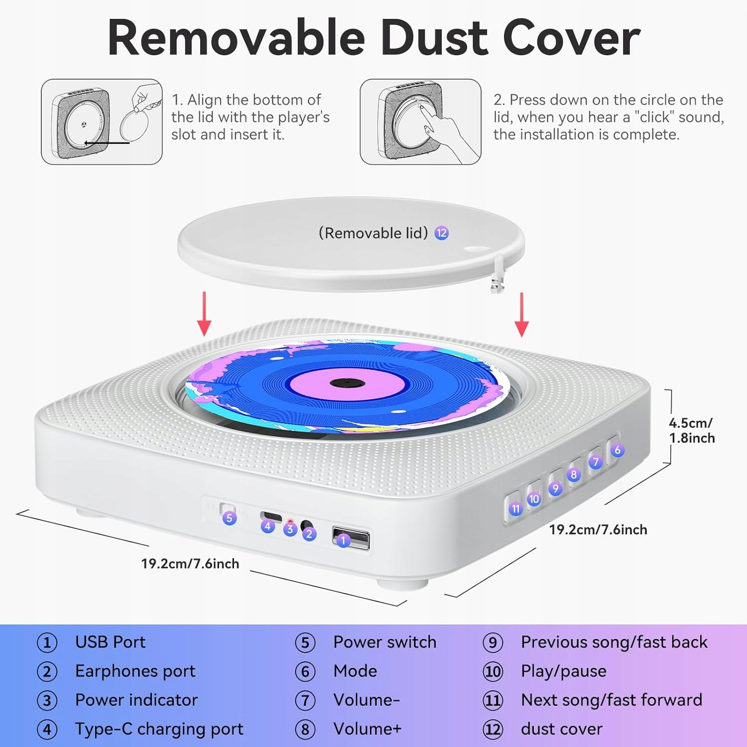 ✅Два способи розміщення: Bluetooth-програвач компакт-дисків постачається з набором для настінного кріплення та пластиною, яку можна легко встановити на стіну, щоб заощадити місце, що робить ваш дім більш елегантним і художнім, а також постачається з настільною підставкою, яку можна легко розмістити на столі або столі. Креативний дизайн пилозахисної кришки означає, що вам не доведеться турбуватися про проблеми з продуктивністю компакт-диска, спричинені накопиченням пилу.