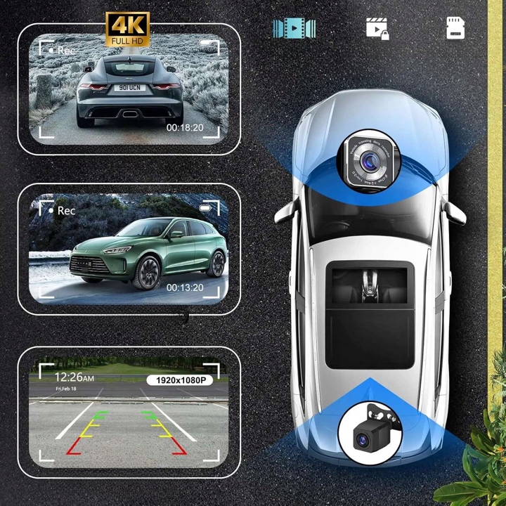 Задня камера також функціонує як камера заднього виду, яка автоматично вмикається, коли ви вмикаєте передачу заднього ходу. Пристрій має функцію циклічного запису, вам не потрібно турбуватися про те, що на карті не вистачить місця - старіша записи автоматично замінюються новими.