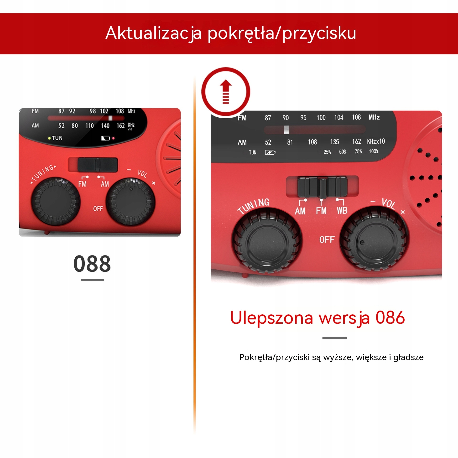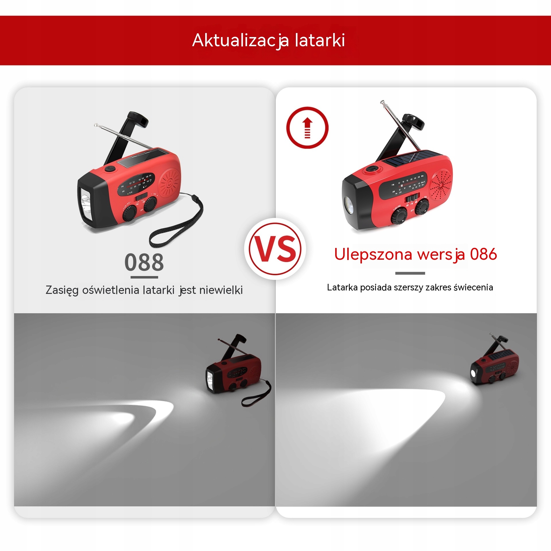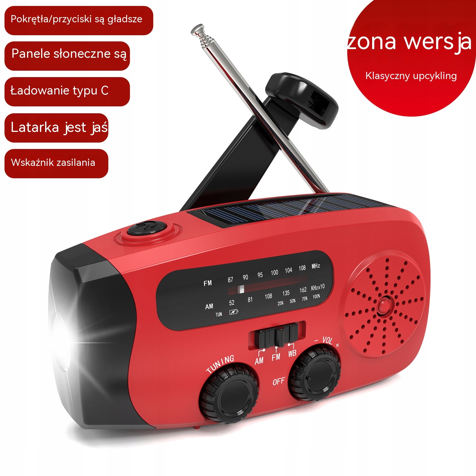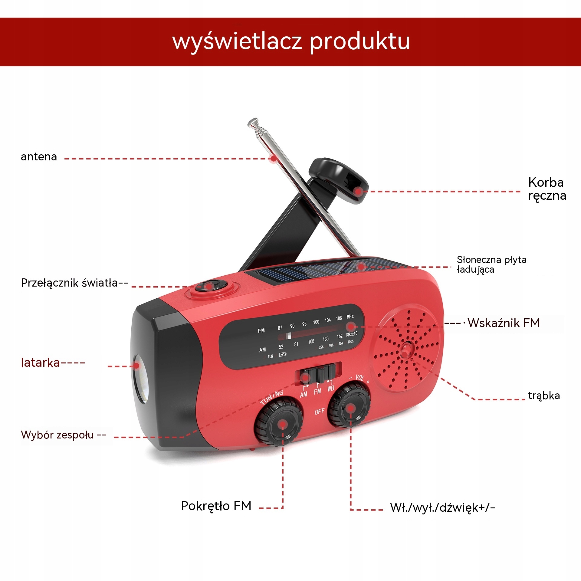 AM: 520-1710 КГц, Європа та Японія 522-1620 КГц Японія FM: 76-108 МГц FM: 87-108 МГц WB :162,400-162,550 МГц Максимальна потужність: 6 Вт Напруга: 2,7-4,2 В Ємність акумулятора: 2000 мАг Вхід: TYPE-C 5 v1a Вихід: 5 v1a Спосіб заряджання: ручне обслуговування, сонячний об’єм, час заряджання через USB: 3-4 години Час заряджання сонячної панелі : помірний Радіо 130 год1хв ручне обслуговування (доступно): 20 год повна потужність лампи: 10 год колір: червоний, синій, зелений, чорно-білий, оранжевий та інші водонепроникний: IPX-3