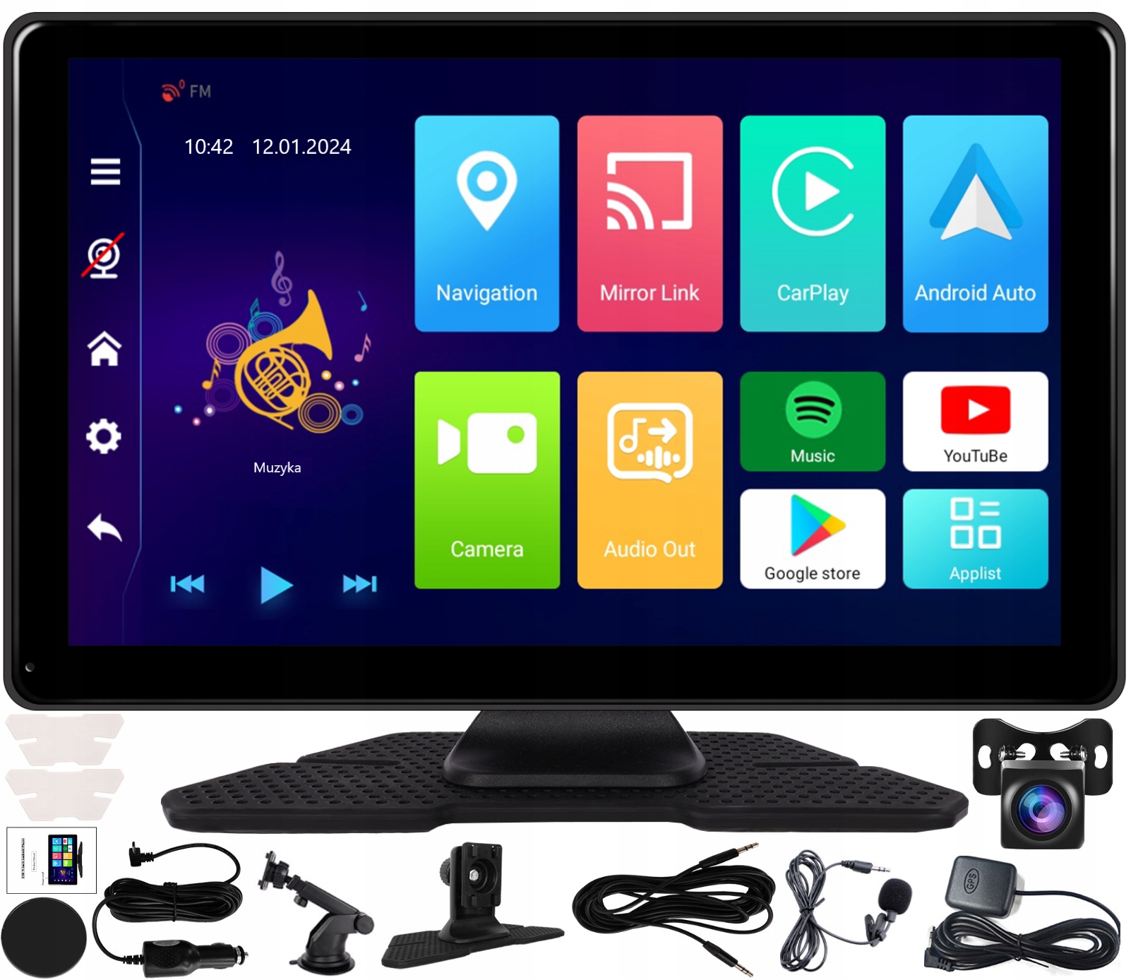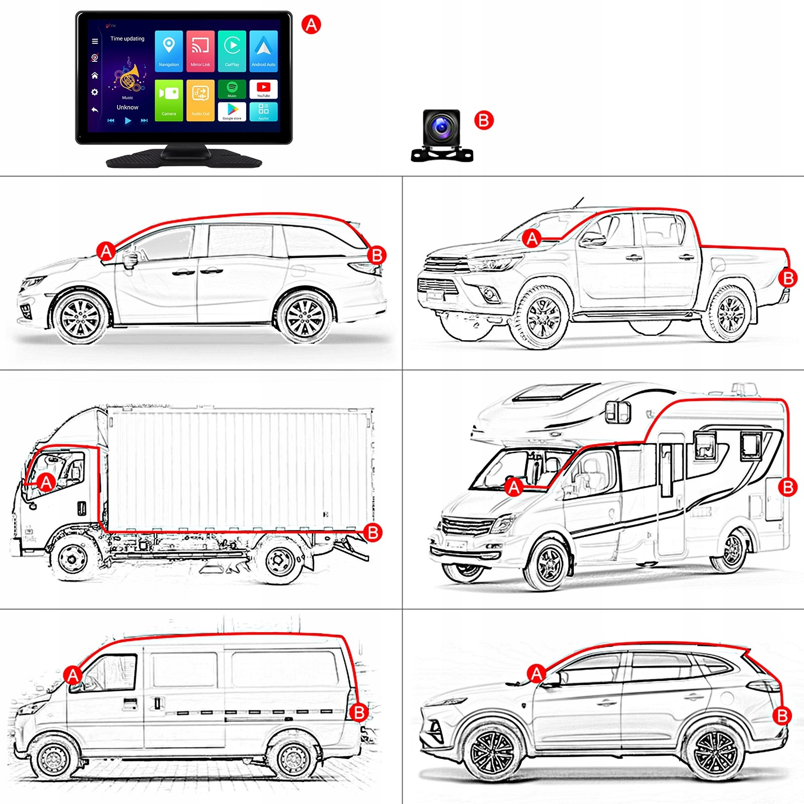 В набір входить 9-дюймовий екран для автомобіля, який можна розмістити на кабіні (приклеїти скотчем 3М або навіть прикрутити) і прикріпити екран до лобового скла за допомогою присоска лобового скла. РК-екран IPS сенсорний з високою роздільною здатністю (1600x600 пікселів). Монітор також має хороші параметри щодо кутів огляду (приблизно 150 градусів по горизонталі), тому це обладнання може знайти своє місце у великих автомобілях, таких як автобуси, фургони чи міжміські автобуси. Тим більше, що сам монітор можна переносити з машини в машину. Монітор має можливість нахилу екрана.