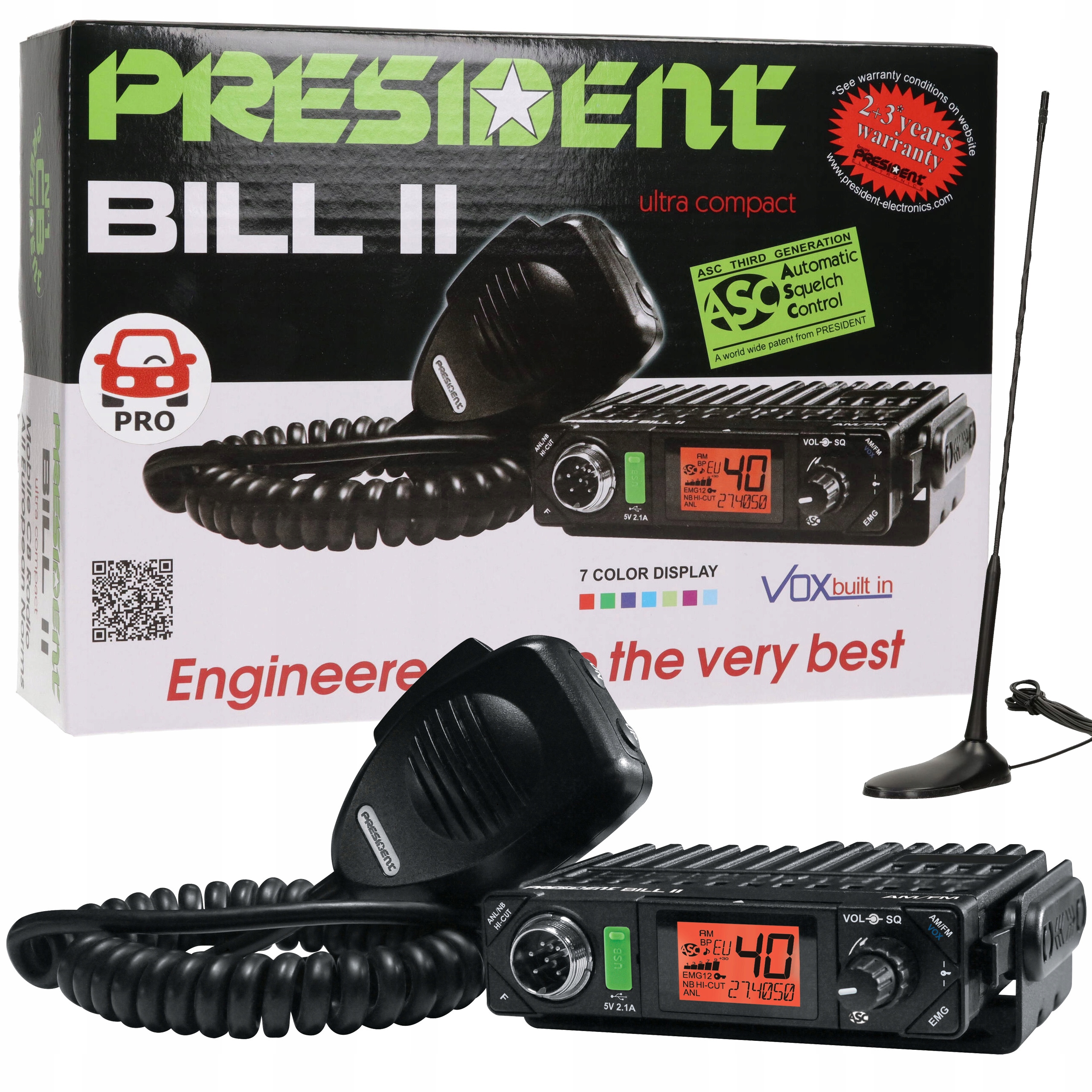 Radio CB President BILL було створено з використанням компонентів найвищої якості. Радіоприймач дозволяє працювати в модуляції AM і FM, з доступом до стандартних 40 каналів (26,960 МГц - 27,405 МГц). Для виробництва магнітоли використовувалися лише найякісніші комплектуючі, що забезпечує тривалий термін служби та відмінну якість використання. Магнітола не потребує жодних доопрацювань чи «тюнінгу» — у заводському стані вона готова до дуже комфортної роботи в будь-яких умовах. CB Radio President Bill відповідає всім необхідним стандартам і дозволено для використання, зокрема: у польському повітрі.