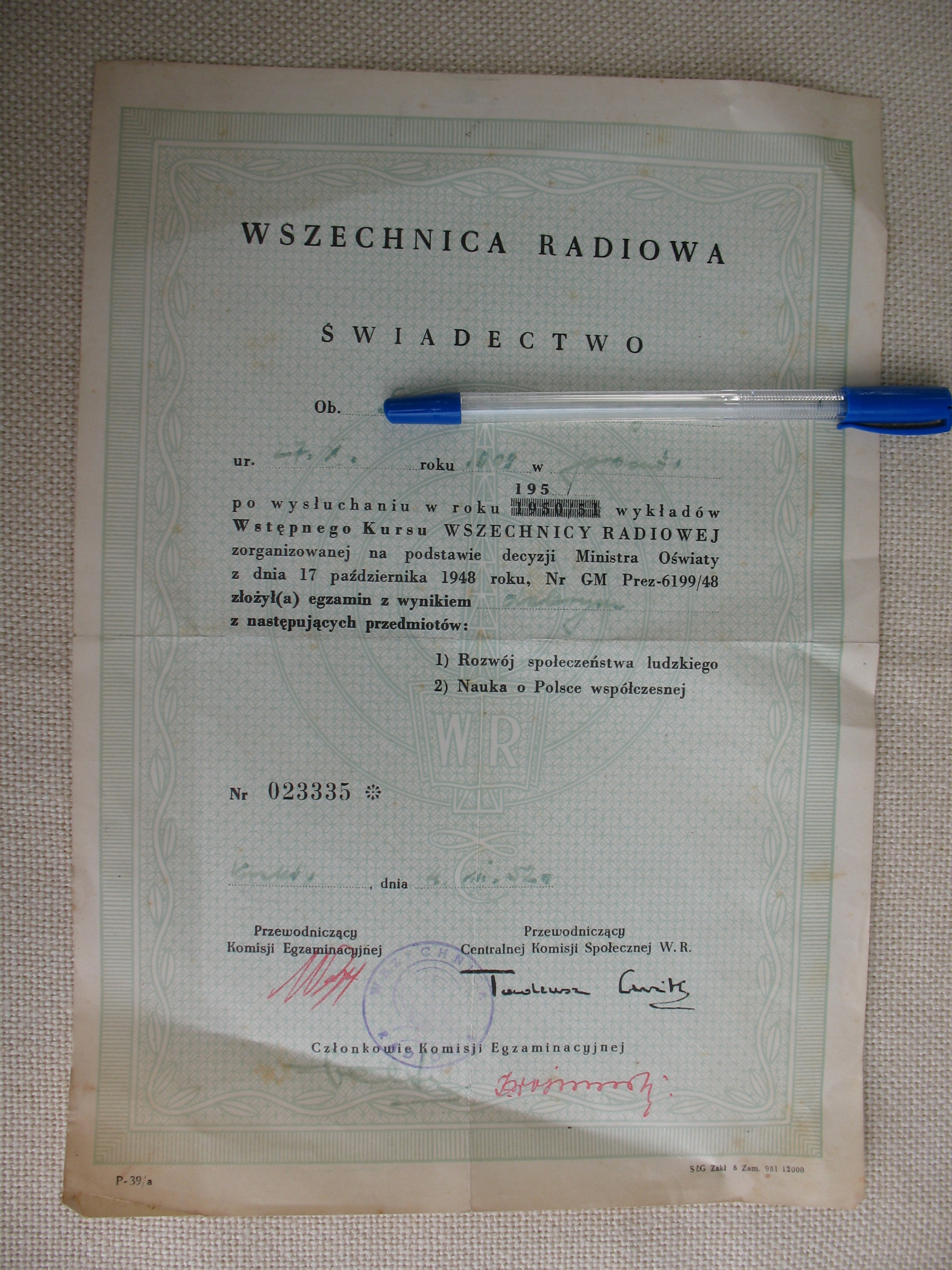 Радіо сертифікат Kraków Wystnica 1952