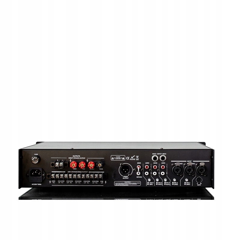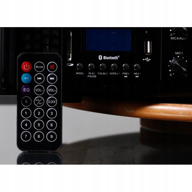 MP3-плеєр - дані із зовнішньої пам'яті USB або SD-карти. З’єднання Bluetooth із пристроями, оснащеними профілем A2DP, наприклад, мобільним телефоном. Світлодіодний індикатор вихідного рівня MASTER VOLUME, загальна корекція низьких і високих частот. Усі дистанційно керовані. Підсилювач має можливість включення фантомного живлення +9V для обслуговування на мікрофонних каналах від MIC-1 до MIC-3, що дозволяє використовувати конденсаторні мікрофони без додаткового обладнання (одночасне використання динамічних мікрофонів на каналах з включеним фантомним живленням). тільки при незбалансованому підключенні - за допомогою двожильного кабелю).