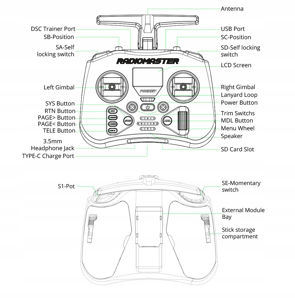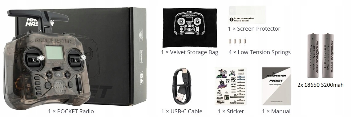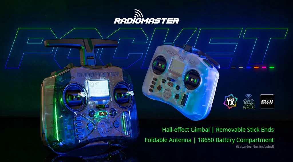 RadioMaster Pocket — це невелике, легке радіо, яке пропонує багато можливостей. Доступні дві версії: ExpressLRS і MPM CC2500, обидві з попередньо встановленою мікропрограмою EdgeTX. RadioMaster Pocket має знімні наконечники та складну антену для зручності транспортування та зберігання. Він сумісний з батареями 18650, які забезпечують тривалий термін служби батареї для годин веселощів.