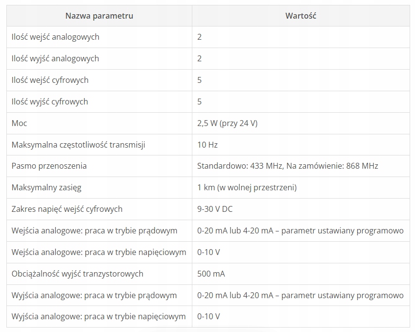 Ланки радіосигналу TM-05-LoRa-WI створюються двома модулями TM-05-LoRa. Кожен модуль має 5 цифрових входів і виходів і 2 аналогових входи і виходи. Сигнали, що надходять на входи першого модуля, передаються на виходи другого модуля, таким чином можлива заміна дротових з’єднань між точками вимірювання та приладами та контролерами. Рішення забезпечує одночасну передачу 10 цифрових сигналів і 4 аналогових сигналів.