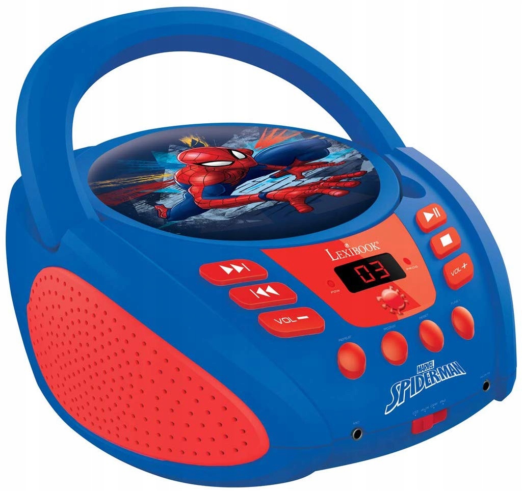 Унікальний CD-програвач для дітей, прикрашений графікою популярного персонажа Людини-павука. Висока якість виготовлення та ретельно підібрана графіка роблять бумбокс ідеальним для дитячої кімнати. Ручка дозволяє зручно переносити пристрій.