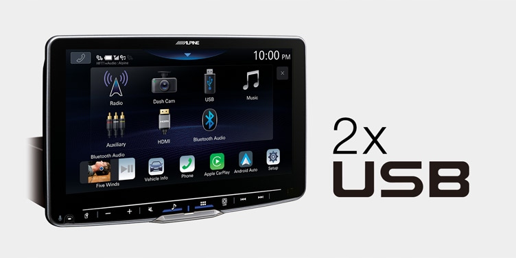 Хоча Alpine Halo9 не має вбудованого приводу CD/DVD, у вас все одно є багато варіантів розваг. 2 USB-порти на задній панелі пристрою дозволяють, наприклад, підключити один мобільний пристрій для зарядки, а інший USB-порт використовується для підключення USB-накопичувача або жорсткого диска для доступу до улюблених аудіо- та відеофайлів. p>
