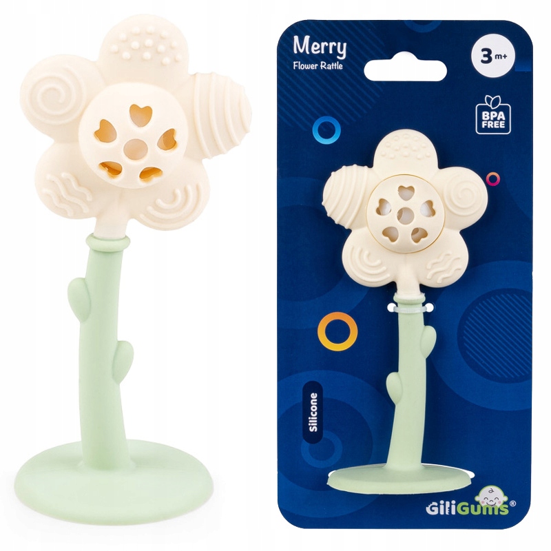 Красива, пастельна квітка радує не лише своєю красою, але й практичністю! Кожна його пелюстка прикрашена виступами різної форми, які при покушуванні будуть масажувати хворі ясна малюка, що ріжуться зуби. Усередині квітки приховане брязкальце, тому щоразу, коли ви трясете іграшку, ваша дитина чутиме веселий звук. Іграшка має довгу ніжку з підставкою, що полегшує захоплення маленькими ручками і дозволяє розмістити її в обраному місці. Виріб призначений для дітей від 3 місяців.