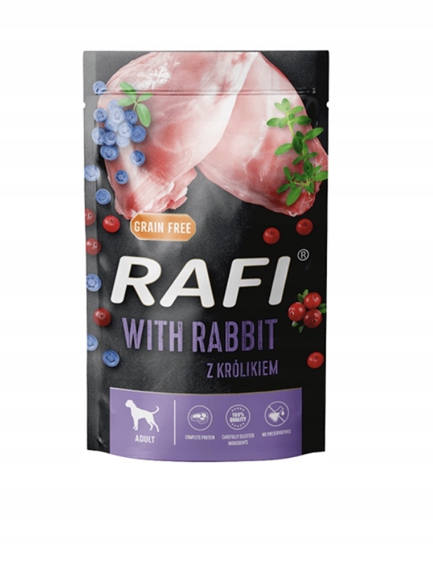Мокра їжа Rafi з кроликом - це продукт, створений на основі сучасних стандартів та рекомендацій щодо правильного харчування дорослих собак. Його склад повністю покриває попит на необхідні поживні речовини, мінерали та вітаміни. М'ясо та сировина від кролика, крім повного білка, що підтримується, є джерелом заліза, селену та цинку, що беруть участь у стимулюванні оборонних функцій організму. Їжа не містить добавок консервантів або барвників, які покращують смак і стимулюють апетит. Ця присутність у складі чорниці, журавлини та чебрецю, природно, збільшує чуттєву привабливість їжі собаки. Додавання лляної олії, насиченої N-3 та N-6 жирних кислот, вітаміну Е та речовинами з протизапальними властивостями, також забезпечує цінні біологічно активні сполуки-фітостероли, які позитивно впливають на покращення функціонування травного тракту. Фрукти (американська чорниця 2%, журавлина 2%), мінерали, олії та жири (лляна олія 0,2%), сушеного чебрецю 0,01%. Вологість - 78%, кальцій - 0,3%, фосфор - 0,25%. Мідь, п’ять -розбіжно) - 0,4 мг, йод (покритий, гранульований кальцій йодан, безводне) - 0,3 мг.