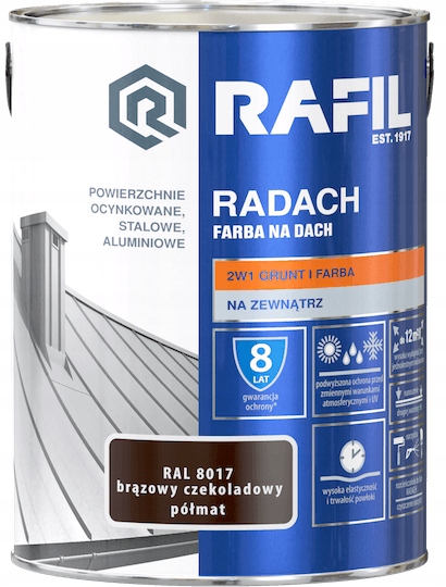 Високоякісна грунт-емаль RADACH ROOF PAINT 2 в 1: грунт + фарба. Забезпечує підвищений захист від мінливих погодних умов і ультрафіолетового випромінювання. Призначений для захисно-декоративного фарбування зовнішніх металевих поверхонь: сталевих, оцинкованих і алюмінієвих. Фарба використовується як для нового фарбування, так і для відновлення старих лакофарбових покриттів. Характеризується чудовою адгезією до основи. Створює швидкосихаючі, дуже еластичні покриття з підвищеною стійкістю до сонячного світла, води та інших атмосферних факторів. RADACH ROOF PAINT забезпечує довговічний декоративний ефект пофарбованих поверхонь, а в поєднанні з Rafil ANTICORROSION PRIMER забезпечує сильний захист від корозії.