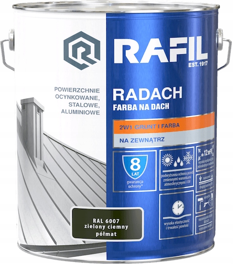 Високоякісна грунт-емаль RADACH ROOF PAINT 2 в 1: грунт + фарба. Забезпечує підвищений захист від мінливих погодних умов і УФ-випромінювання. Призначений для захисно-декоративного фарбування зовнішніх металевих поверхонь: сталевих, оцинкованих і алюмінієвих. Фарба використовується як для нового фарбування, так і для відновлення старих лакофарбових покриттів. Характеризується чудовою адгезією до основи. Створює швидкосихаючі, дуже еластичні покриття з підвищеною стійкістю до сонячного світла, води та інших атмосферних факторів. RADACH ROOF PAINT забезпечує довговічний декоративний ефект пофарбованих поверхонь, а в поєднанні з Rafil ANTI-CORROSION PRIMER забезпечує сильний захист від корозії.