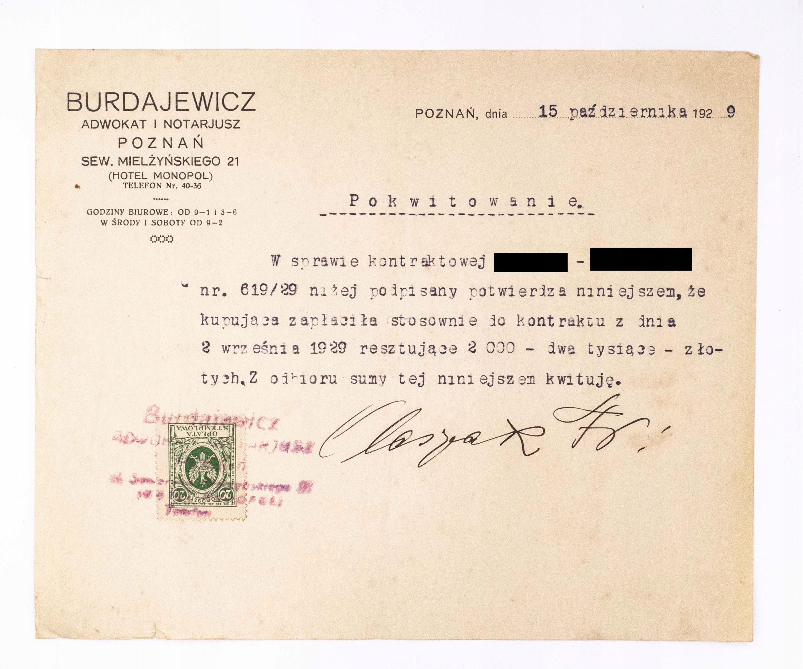 РАХУНОК - АДВОКАТ І НОТАРІУС БУРДАЄВИЧ, ГОТЕЛЬ "МОНОПОЛЬ", ПОЗНАНЬ 1929 р.