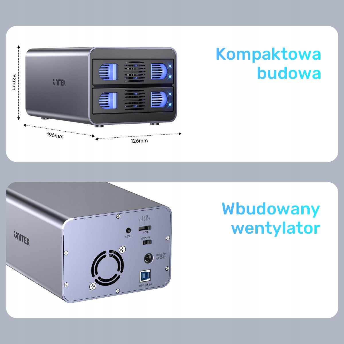 - Підтримка дисків 2,5" і 3,5". Завдяки універсальним відсікам пристрій може вмістити як менші диски 2,5", так і більші 3,5", що збільшує його гнучкість і дозволяє використовувати різноманітні носії.