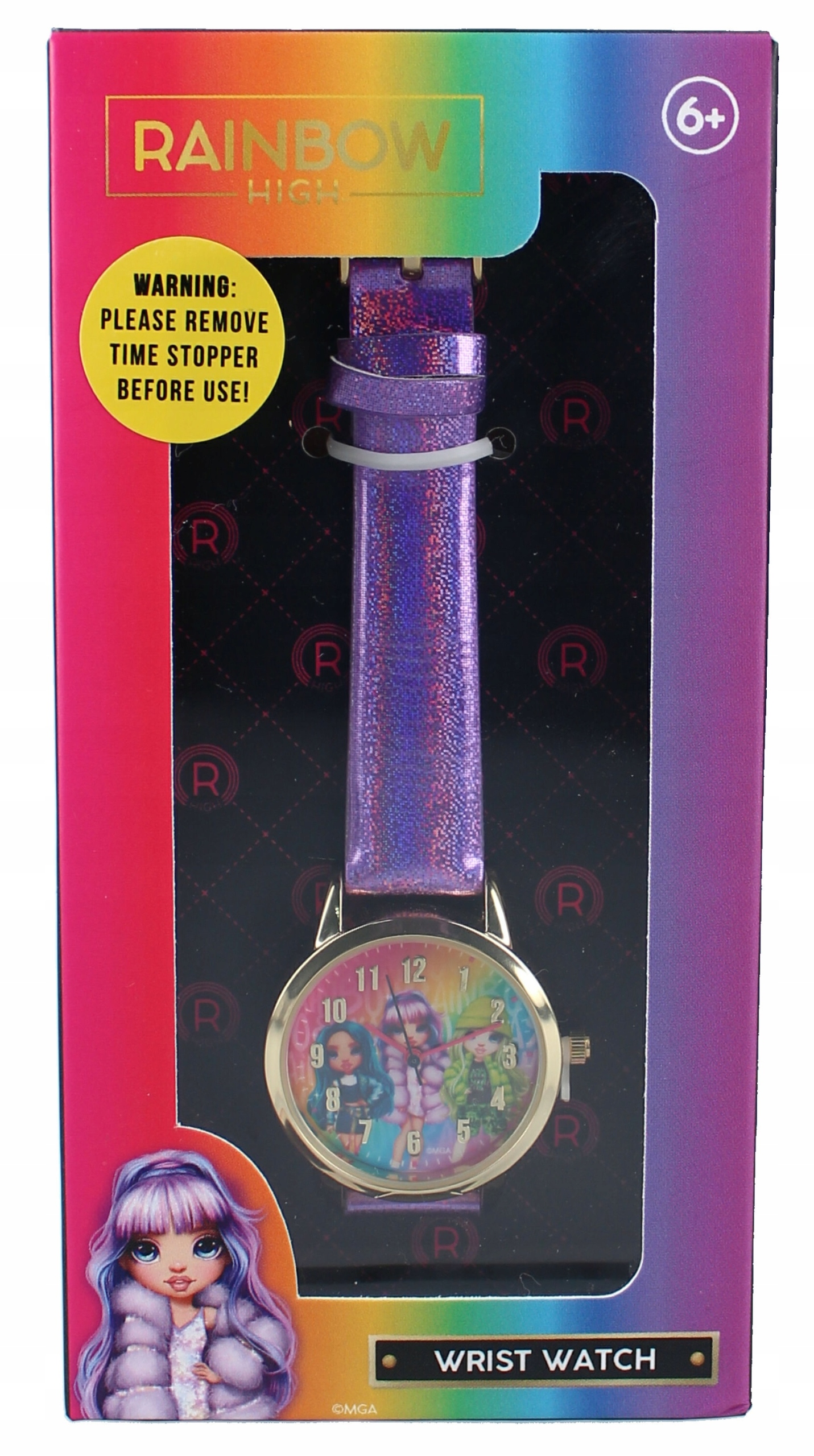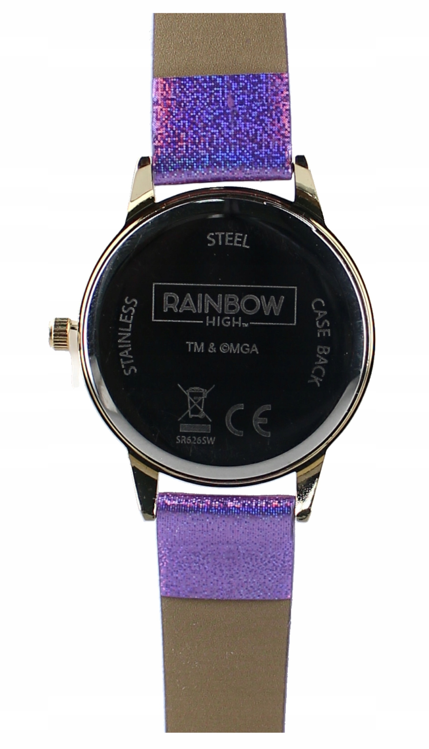 Циферблат і ремінець із зображенням і логотипом ляльок Rainbow High. Пояс з голографічним ефектом, який красиво переливається. Упаковано в коробку - чудово підходить для подарунка.