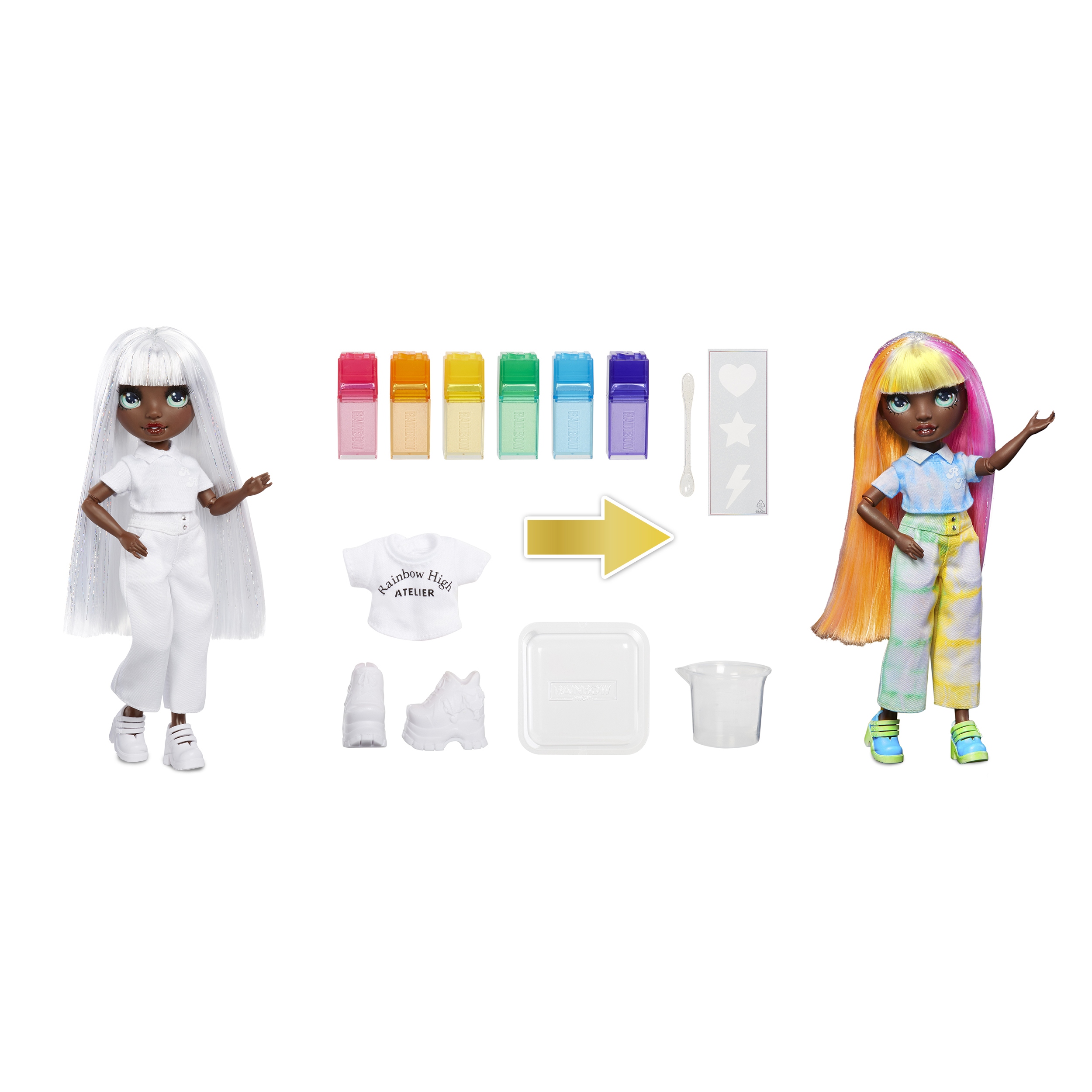 Зробіть власну ляльку Rainbow High! В упаковці ви знайдете ляльку з білим волоссям, одягнену з ніг до голови в біле. Також було 6 пральних веселкових порошків (червоний, помаранчевий, жовтий, зелений, синій і фіолетовий), гумки для батика та губка для нанесення.