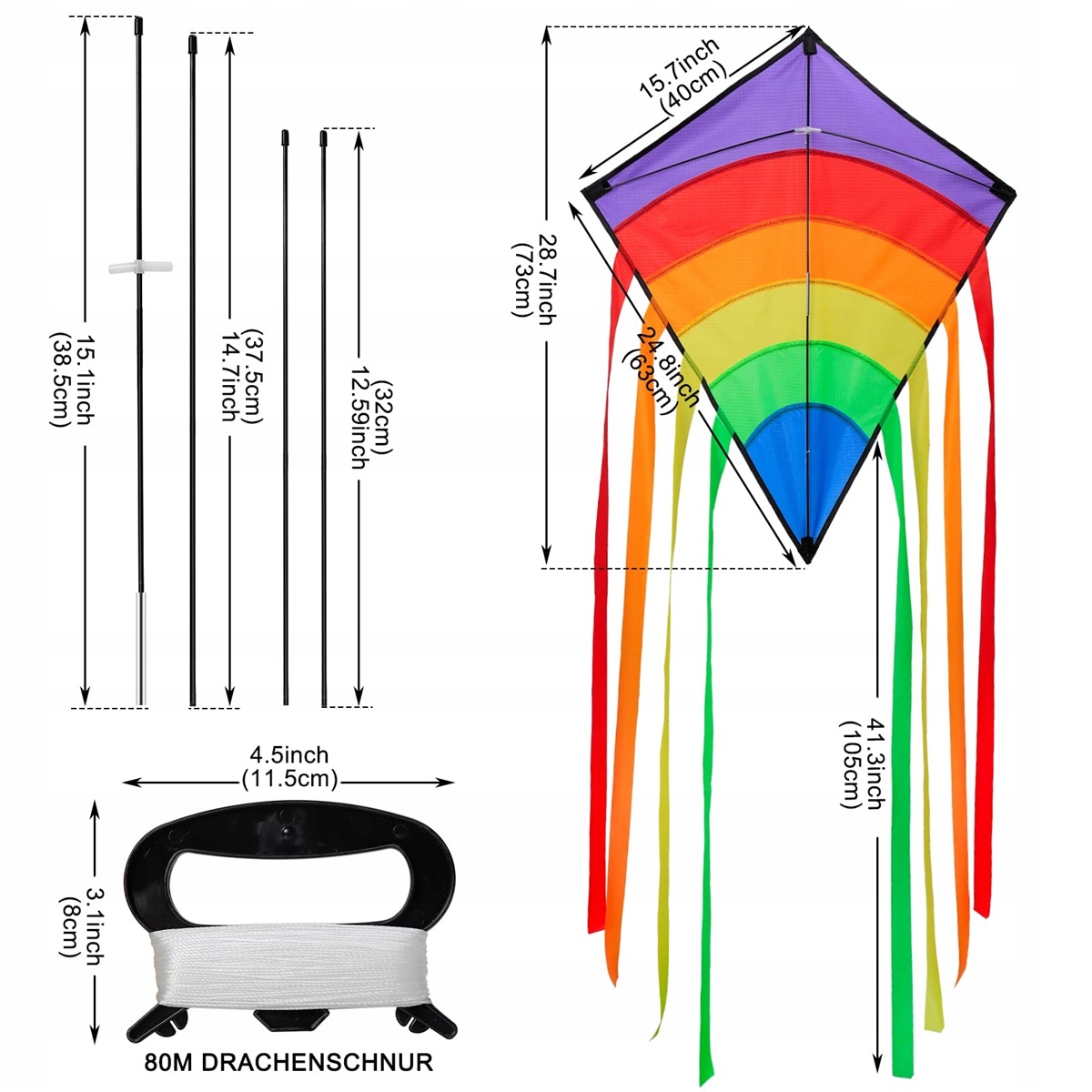 Кольоровий повітряний змій: райдужний повітряний змій має розміри 73 x 65 см із 8 відповідними різнокольоровими хвостами довжиною 105 см і лінією довжиною 80 метрів. набір повітряних зміїв, простий у збиранні, ідеальний для початківців. Барвистий візерунок робить дракона чітко видимим з великої висоти. Захоплюючий момент, коли повітряний змій злітає в повітря, стає незабутнім для дітей