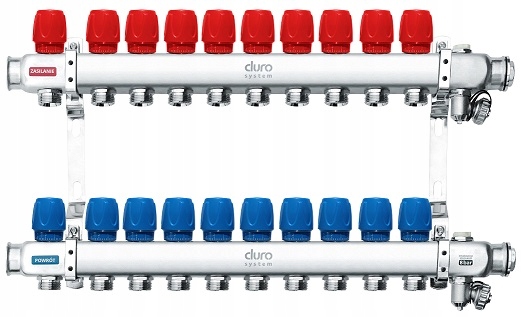 дистриб'ютор до O.p. - - профільованого (40 х 41 мм) з матовою нержавіючої сталі у виду 1.4301 (304), товщина стінки 1,6 мм, - з'єднувальні роз'єми GZ 3/4 "нагрівання з Юроконус -сокетами, - 2 руками вентилятор односяжно), - променеві 3/4 Вилку з прокладкою, яка також використовується для відкриття та закриття клапанів, - регулювання клапанів ручками: червоний на колекторі подачі, синій на зворотному колекторі, - колекціонер ручки з демпфірними вставками.