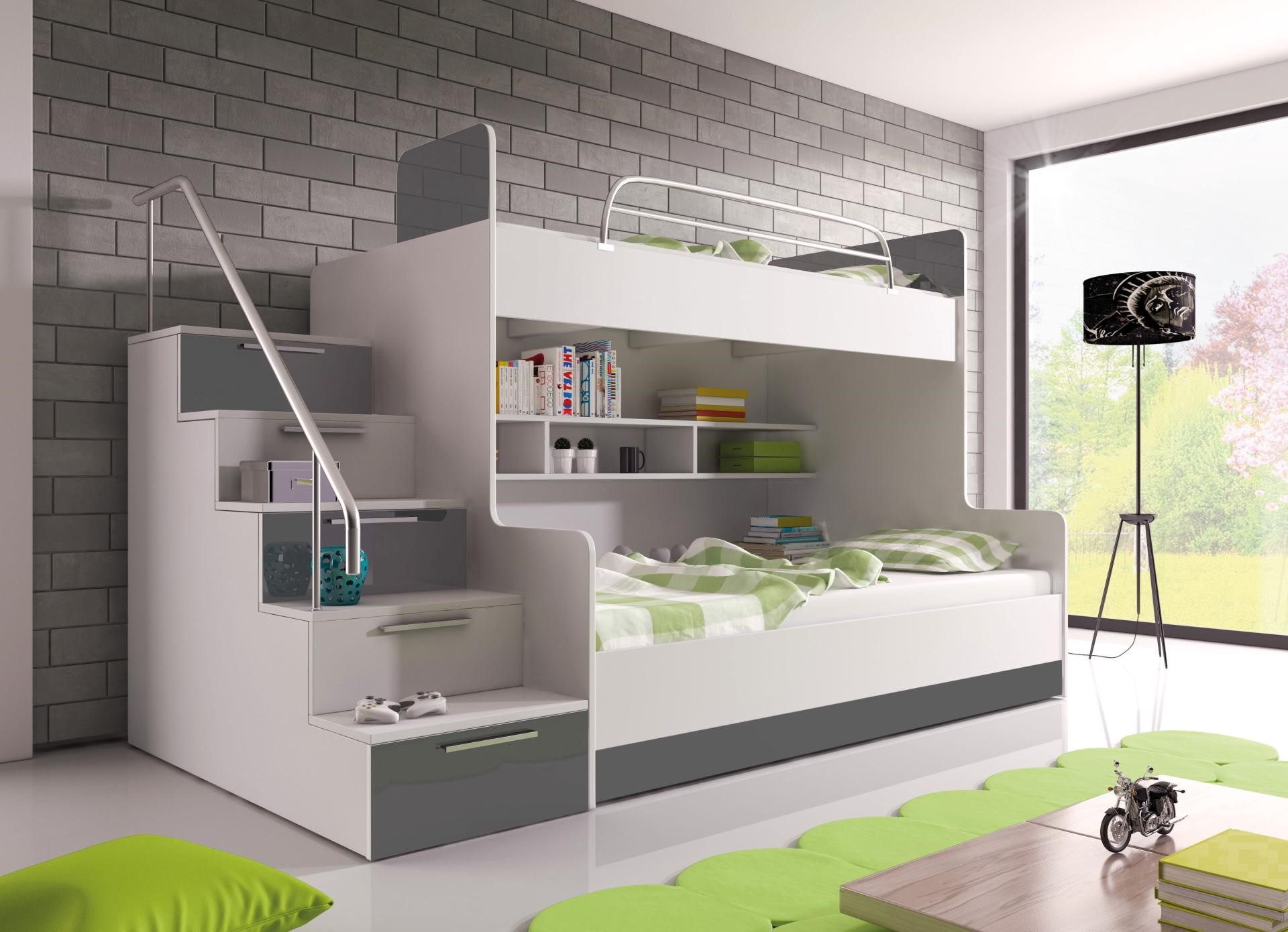 Ліжко характеризується сучасним дизайном і точною якістю виготовлення, що забезпечує винятково хороший сон і гарантію безпеки і впевненості, що ваша дитина прокинеться відпочилою. Фасади гарнітура виготовлені з глянцевої меблевої плити МДФ насичених кольорів, що дозволить підібрати меблі до будь-якої кімнати. Верхня поверхня для сну та сходинки біля ліжка оснащені поручнями, щоб захистити дитину від випадання.