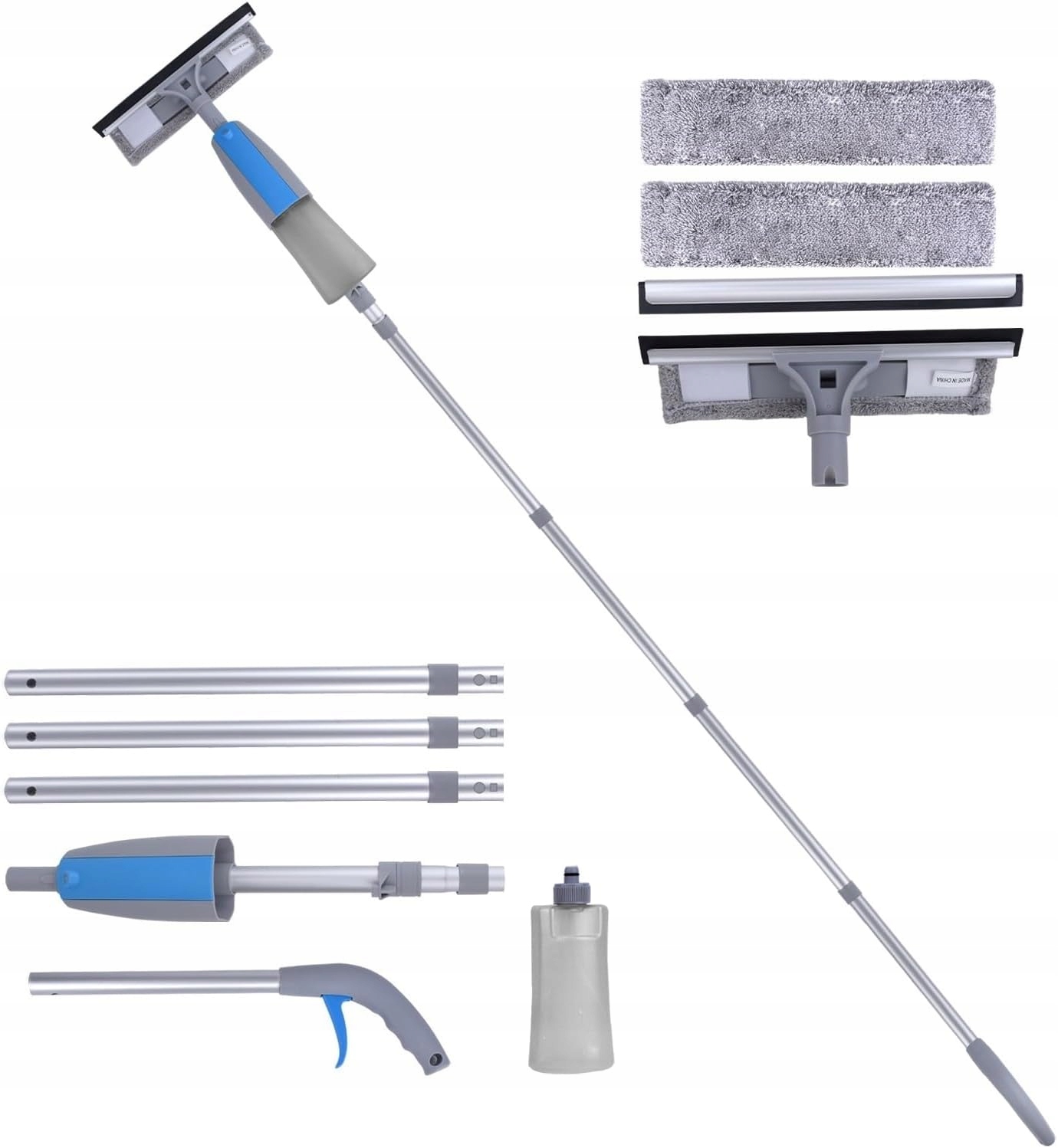 ⏩ Цей засіб для миття вікон постачається з пляшкою з розпилювачем, наповнену водою або миючим засобом, ви можете розпорошити його на вікно, щоб краще очистити стійкі плями на вікнах, а регульована висота 47-190 см дозволяє легко мити високі вікна, які знаходяться всередині та зовні, роблячи миття вікон легким та приємним.