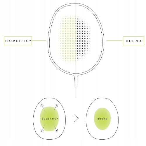 Ізометрична форма головки ракетки максимізує площу перетину основної та поперечної струн, таким чином збільшуючи зону активного удару навіть для ударів не по центру.