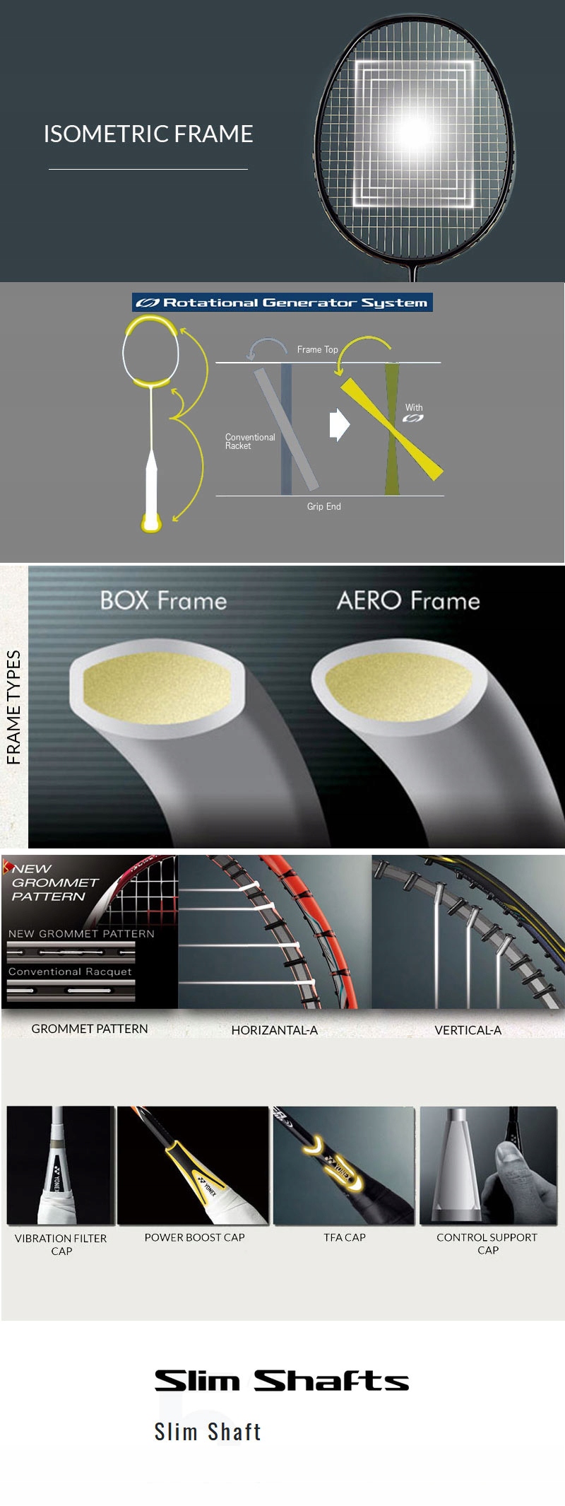 Використовуючи досвід колекції Voltric, у якій вага розподілялася на головку ракетки, Yonex створив нову серію ASTROX, яка додатково використовує принцип противаги. Навантажена в двох точках, симетрична головка ідеально надає швидкості та потужності ударам, а додаткове навантаження на кінцеву частину ручки ракетки забезпечує ефект противаги. Результатом цього рішення є підвищена стабільність і відхилення ракетки, а також її швидке повернення до наступного замаху.