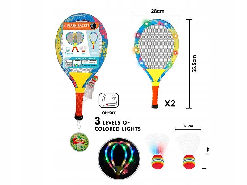 RAKIETKI PALETKI ZE ŚWIATŁEM GRA BADMINTON 55CM ŚWIECĄCE + LOTKA