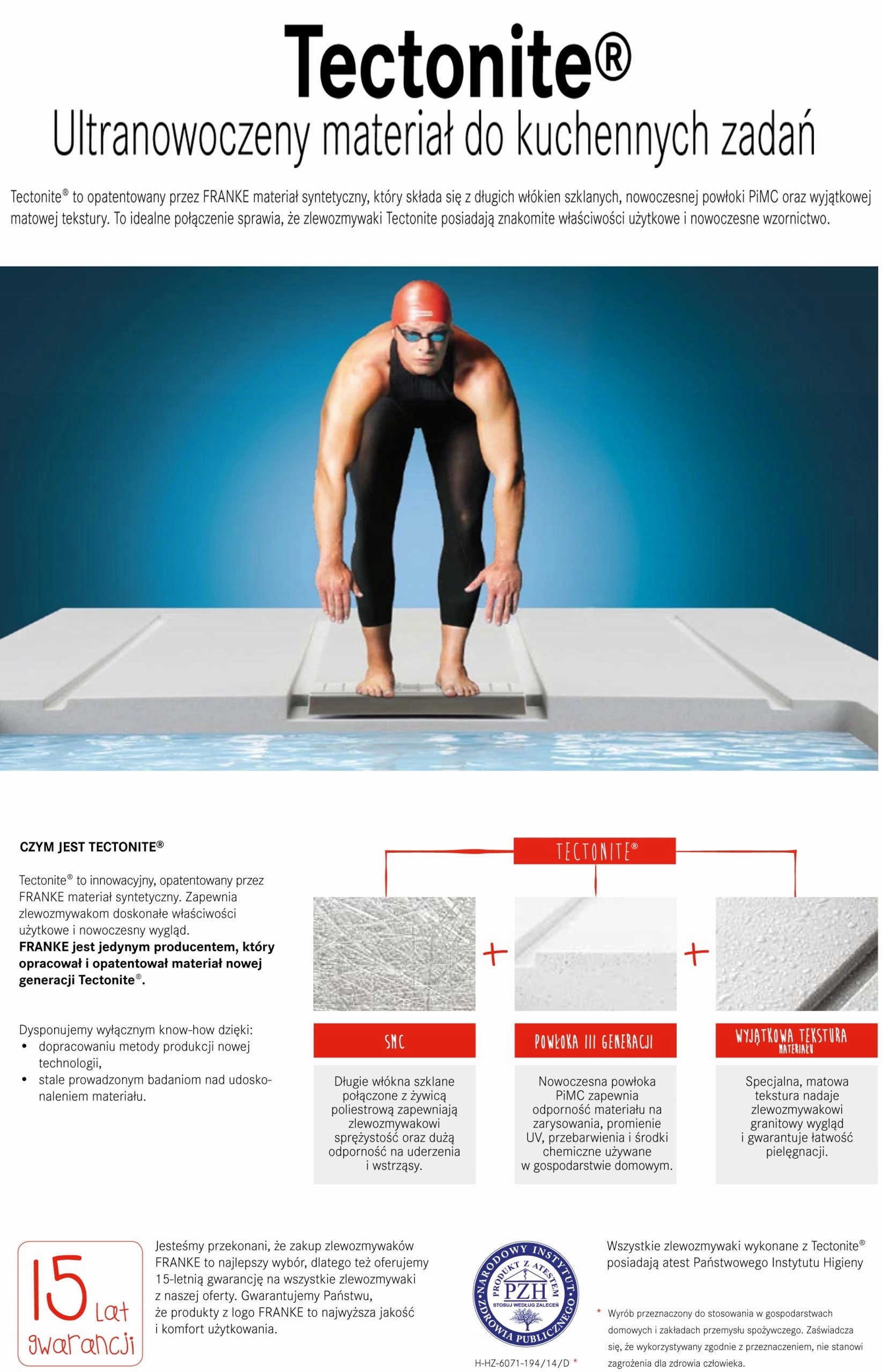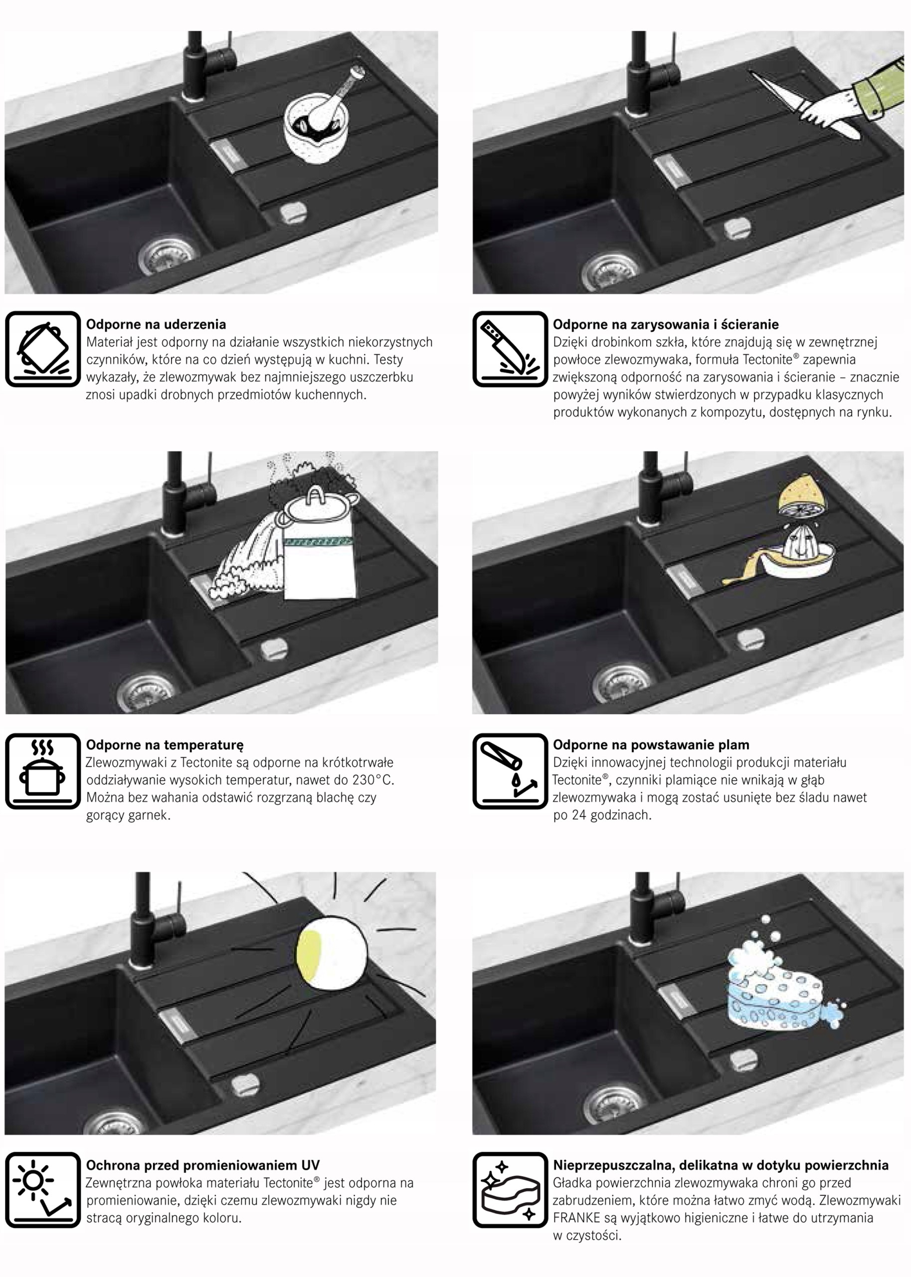 Мийки з Tectonite® надзвичайно елегантні та додають кухні природного вигляду. Tectonite® — це міцний матеріал, схожий на граніт, з унікальним покриттям. Мийки з Tectonite®, незважаючи на високу стійкість до високих температур, ударів, подряпин і плям, дуже легкі в порівнянні з мийками з граніту. Характеризується ніжною текстурою поверхні, яка, однак, не є пористою, що забезпечує високий гігієнічний стандарт