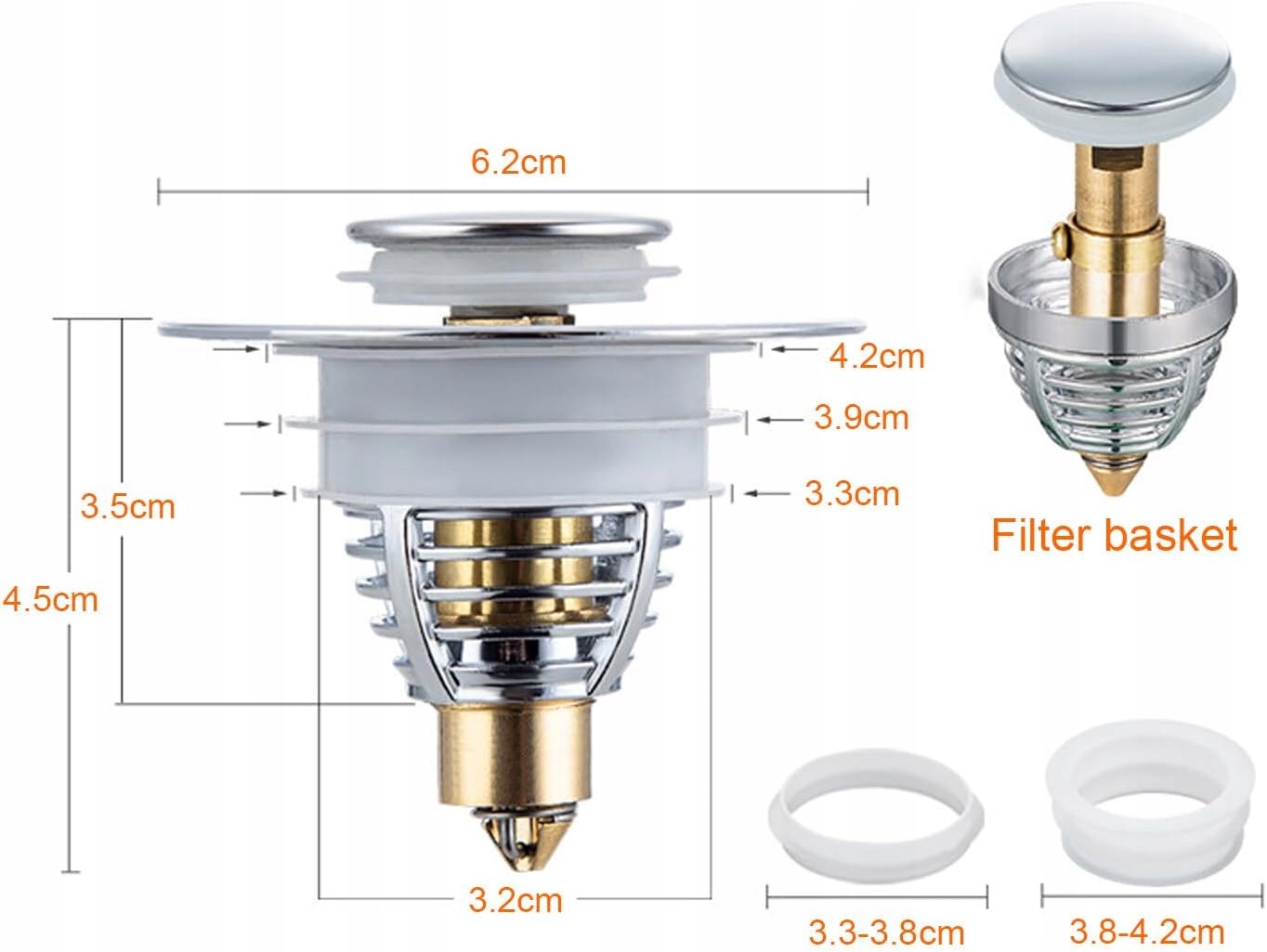 Використовуйте його як зливну пробку для дренажу або зберігання води або як зберігання раковини, щоб зупинити щоденні віски та запобігти засміченню раковини. Він відповідає більшості нижчих 32 см дикого діаметра, що підходить майже для всіх американських раковин ванни та ванн. Зроблений з міцної мосії з елегантною та балакучою обробкою, вихідна вилка нашої раковини є нержавіючої стійкої до забивання та розтягування. Велика ковпачка дотримується отвору раковини і ідеально вписується з Zienkowe Washbasin, а кнопка управління стимулює слайд. Це не потребує сантехніки або інструментів, просто замініть стару пробку для нашої вихідної пробки та заощадить час та гроші.