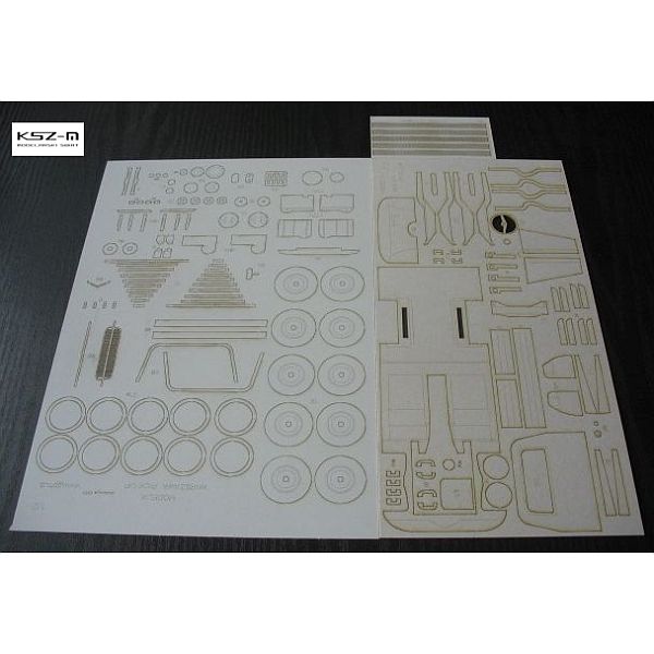 Вирізані лазером елементи моделі, які в оригінальному вирізі потребують склеювання відповідної товщини картону. Ці елементи точно вирізаються лазерним плотером відразу в картоні відповідної товщини і вимагають лише виштовхування з аркуша пальцем (вони з'єднані лише маленькими з'єднувачами).