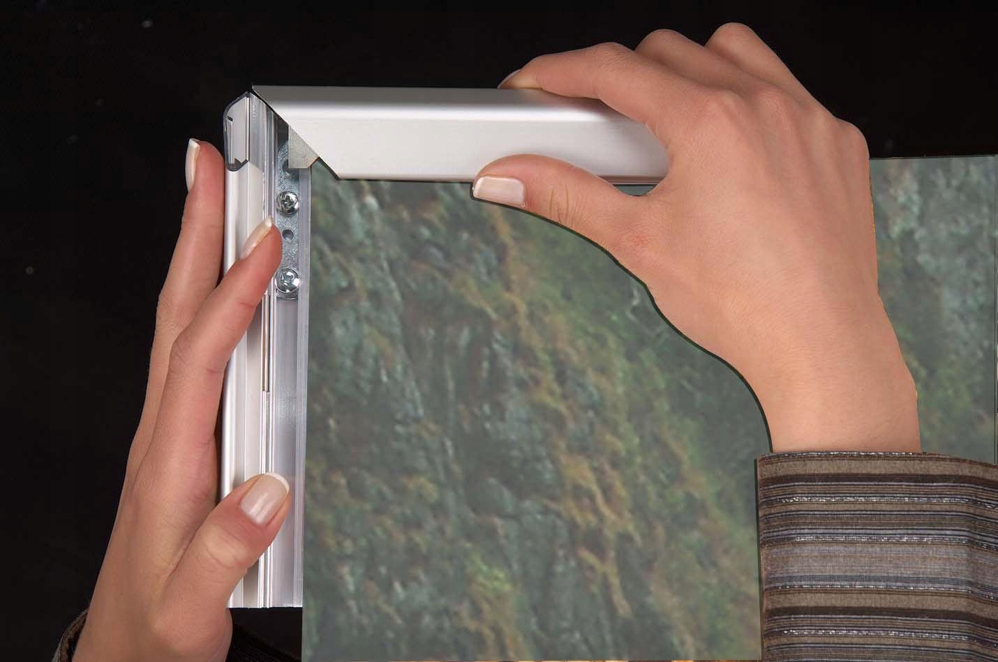 Закрита плакатна рама має нахилену сторони otz , завдяки якому заміна плаката швидка і проста. Просто розблокуйте кадр, покладіть новий плакат і закрийте його назад, що дозволяє швидко оновити інформацію . антирефлективна фольга виготовлена ​​з прозорого пластику захищає плакат проти відбивачів та пилу, що означає, що представлений вміст завжди є розбірливим і естетичним.