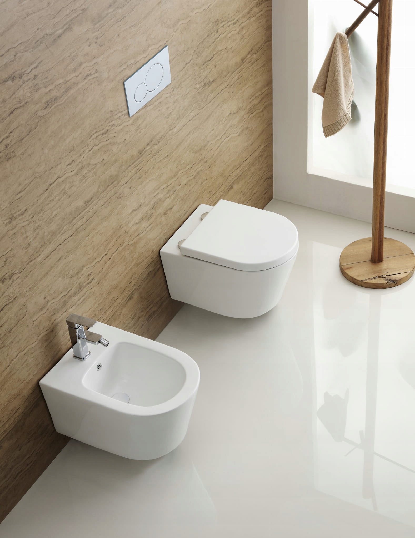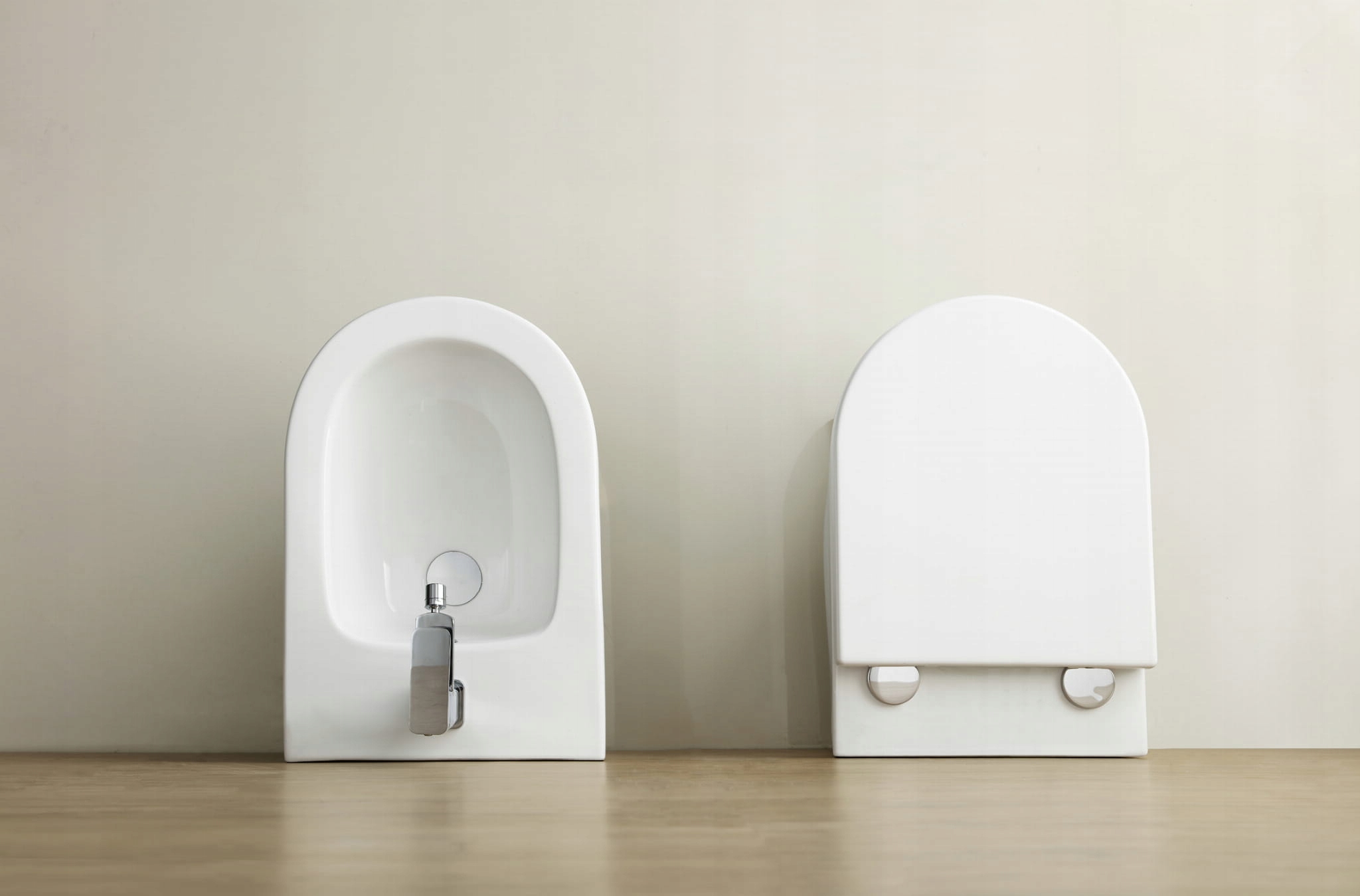 Сформований овальний унітаз і біде. Покриття NANO, невидиме неозброєним оком, забезпечує бездоганну чистоту та антибактеріальний захист усієї поверхні.
