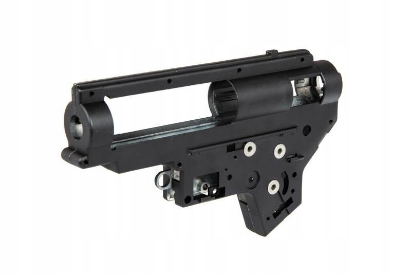 Міцна коробка передач V2, виготовлена з металу, призначена для копій гвинтівок AR15. Рама адаптована до системи швидкої заміни пружин ESA™.