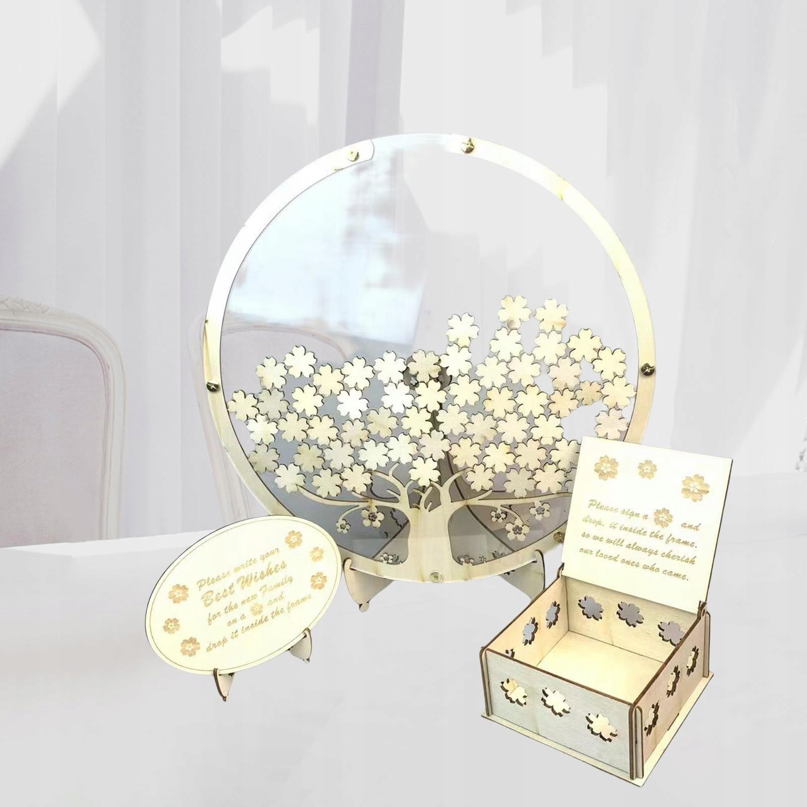 Простий у використанні: гості, які прибувають, можуть взяти маленький дерев’яний знак у коробці, написати свої благословення та помістити їх у великі круглі декоративні прикраси.