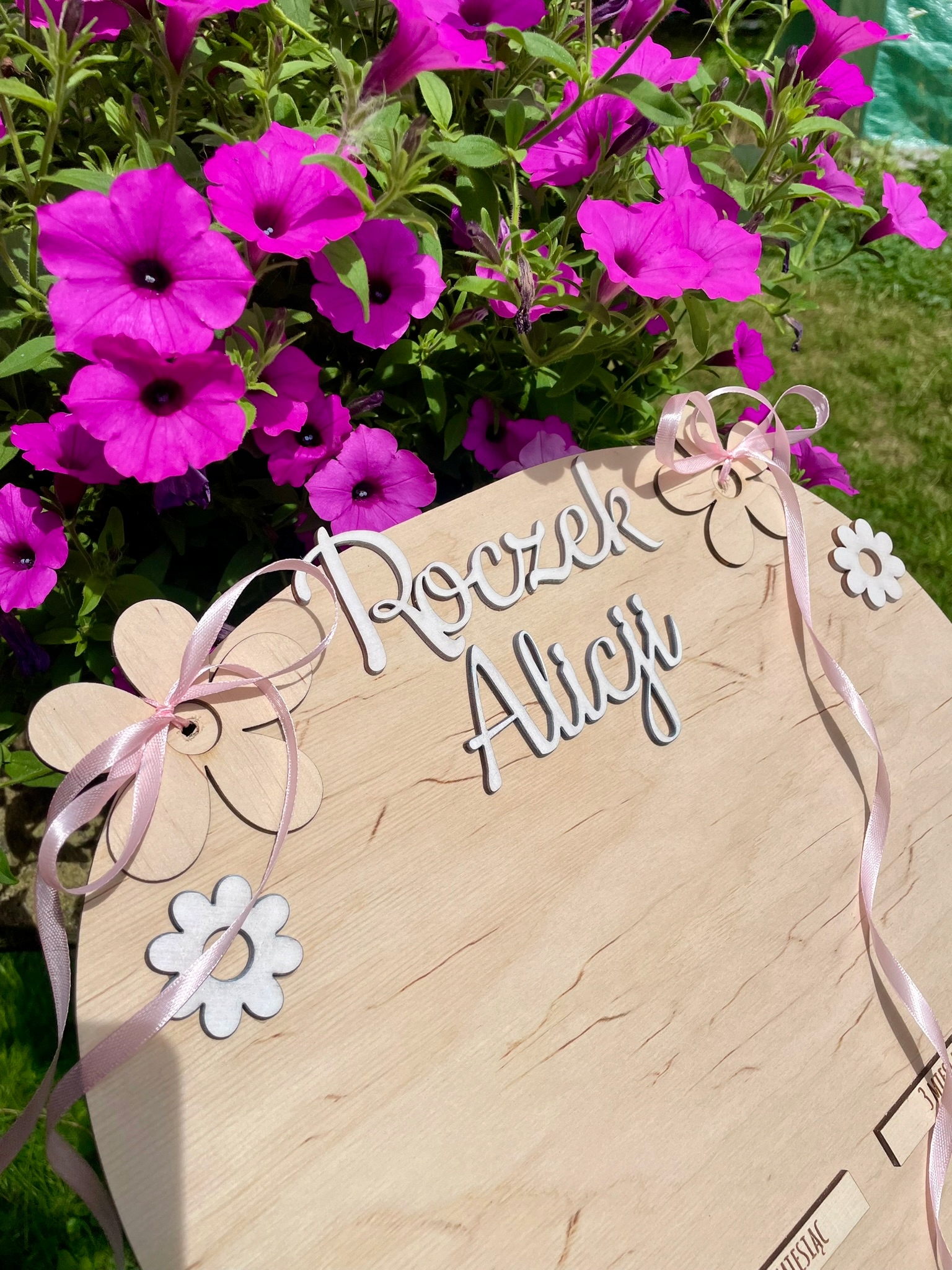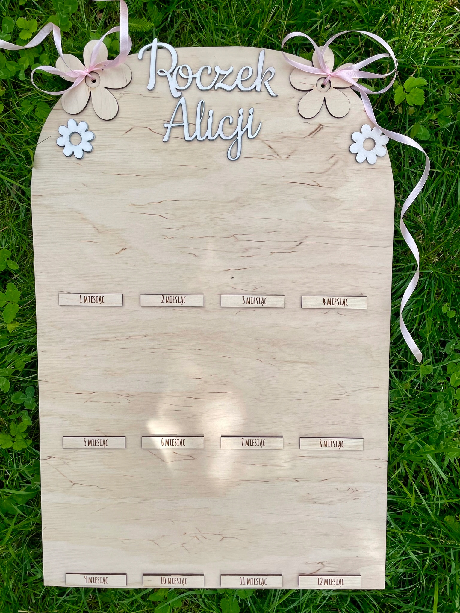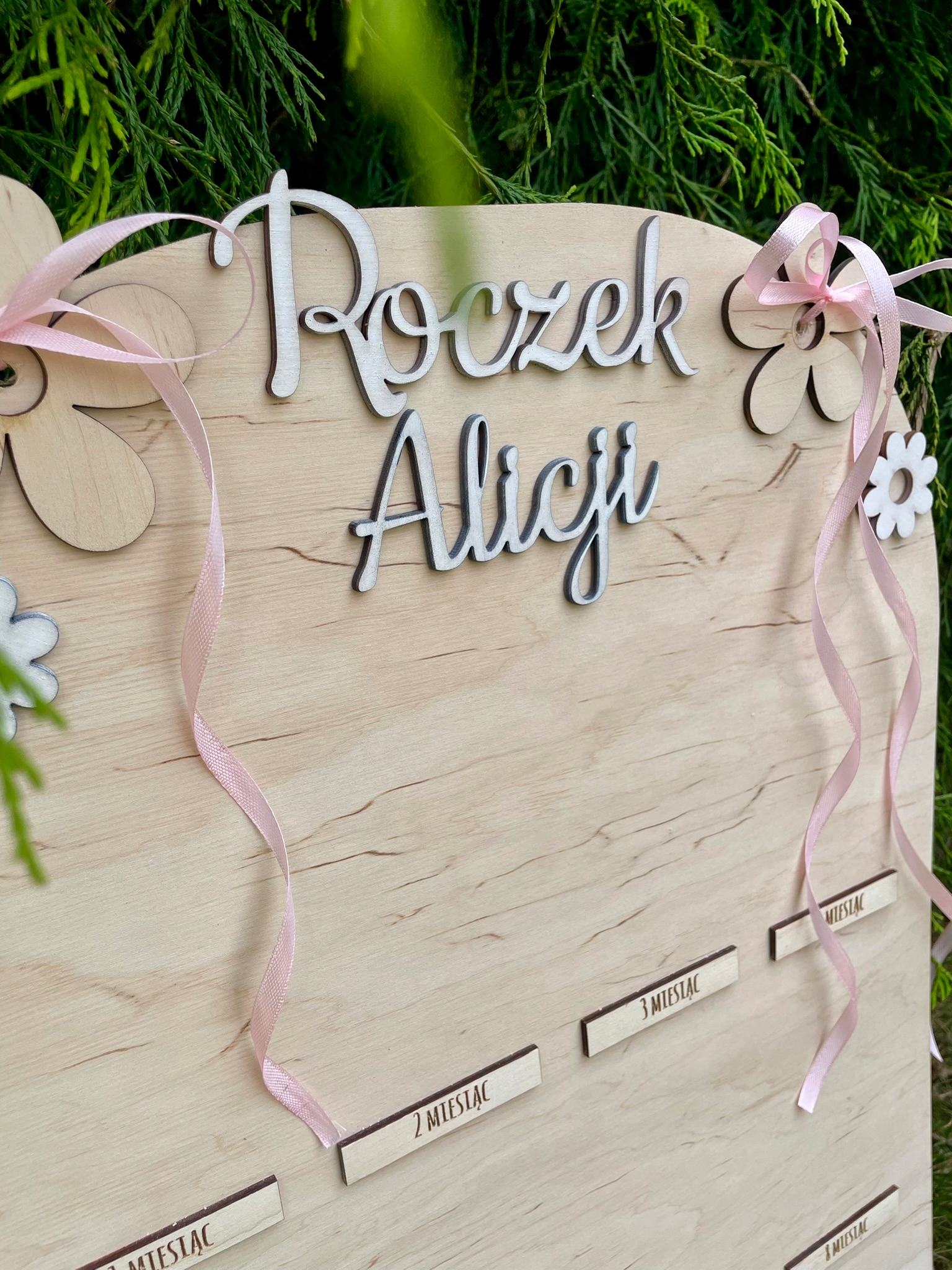 Дерев'яна дошка для фотографій першого року дитини з декоративними бантами та ромашками